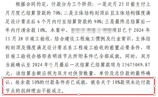 基于此,我们在代理意见中提出:根据建设工程施工行业惯例,主体结构封顶是竣工验收的前置条件——项目已竣工,即表明所有节点条件已成就;最后一次结算确认了总货款,在实质上已具备最终结算的性质,不能允许一方以未完成“最终结算”为由无限期拖延付款。