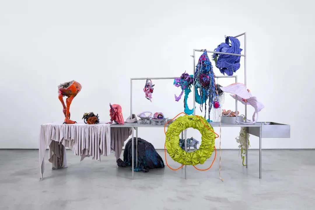比她年轻33岁的禹韩娜(Woo Hannah,1988年出生)展出了看似混合体形态的可穿戴物品。她使用从当地商铺或工作室搜集来的布料和边角料,创作出色彩鲜艳、令人联想起动物或人体器官的作品。两位艺术家都对材料与概念进行转变与嬗变:Yang Juhae将遗留物品升华为坚韧与关怀的载体,禹韩娜则提出了一种基于流动身份与协作的具身体现。