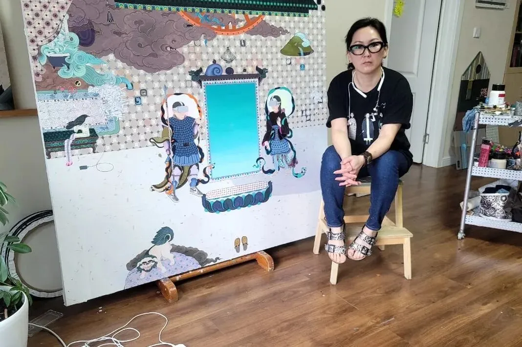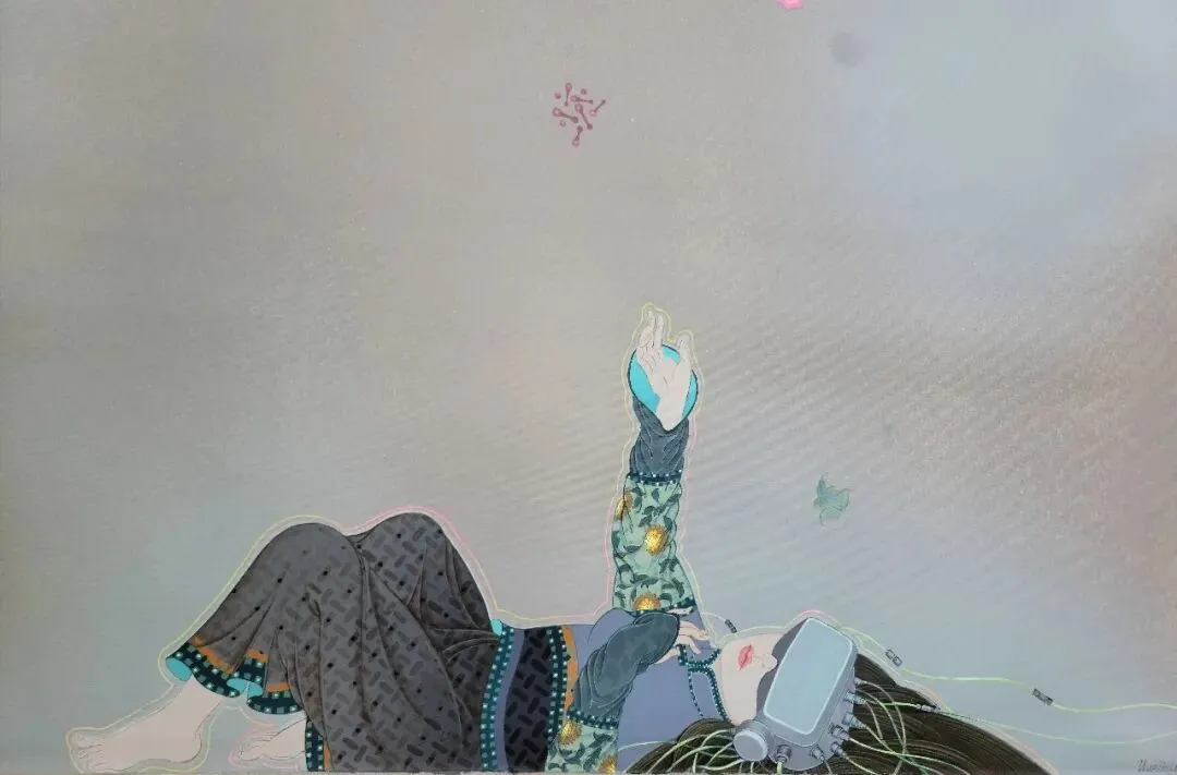 与此同时,蒙古艺术家Uuriintuya Dagvasambuu(1979年出生)则是蒙古传统绘画(Mongol zurag,一种描绘日常生活场景的平面、色彩丰富的画作)的当代大师,她将这种技法与佛教图像、超现实主义和未来主义融为一体,创造出当代女性战士的形象。对这两位艺术家而言,过去、现在和未来在描绘女性力量的宏伟叙事中交织融合,这与西方语境下的理论女性主义形成鲜明对比。