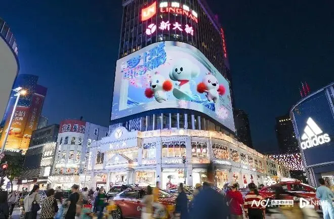广州市北京路新大新大厦,十五运会吉祥物“喜洋洋”和“乐融融”跃然屏上。受访者供图