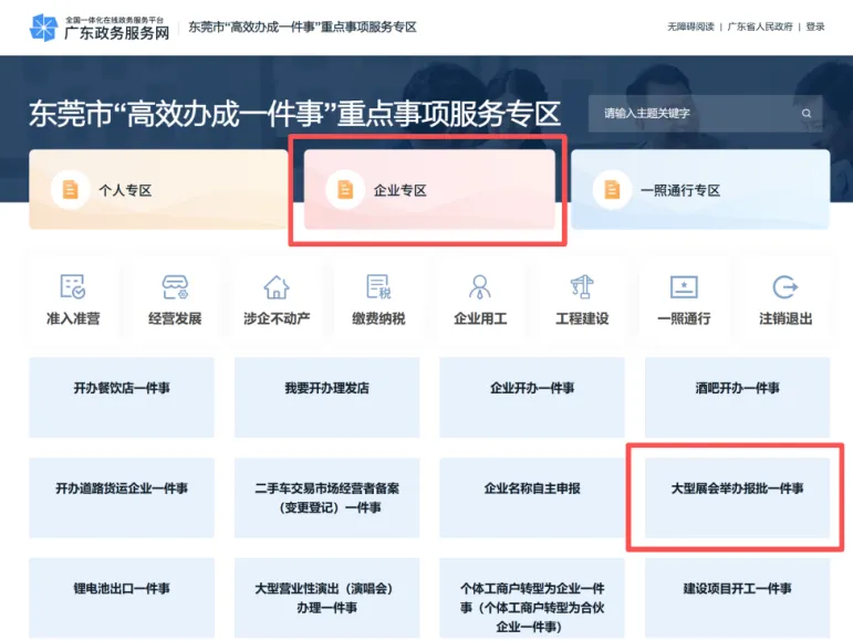 2.在该页面“特色创新”板块,点击“东莞市‘高效办成一件事’”,进入“企业专区”后,选择“大型展会举办报批‘一件事’”入口;