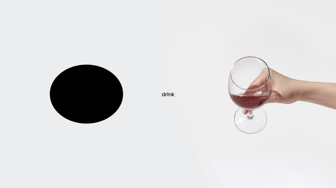 喝葡萄酒的动作被理解为面对葡萄酒,并与每个欣赏酒杯的动作相联系。这两个圆形的图案分别是酒杯和喝酒的人,彼此面对面,表示要进行日常旅行。