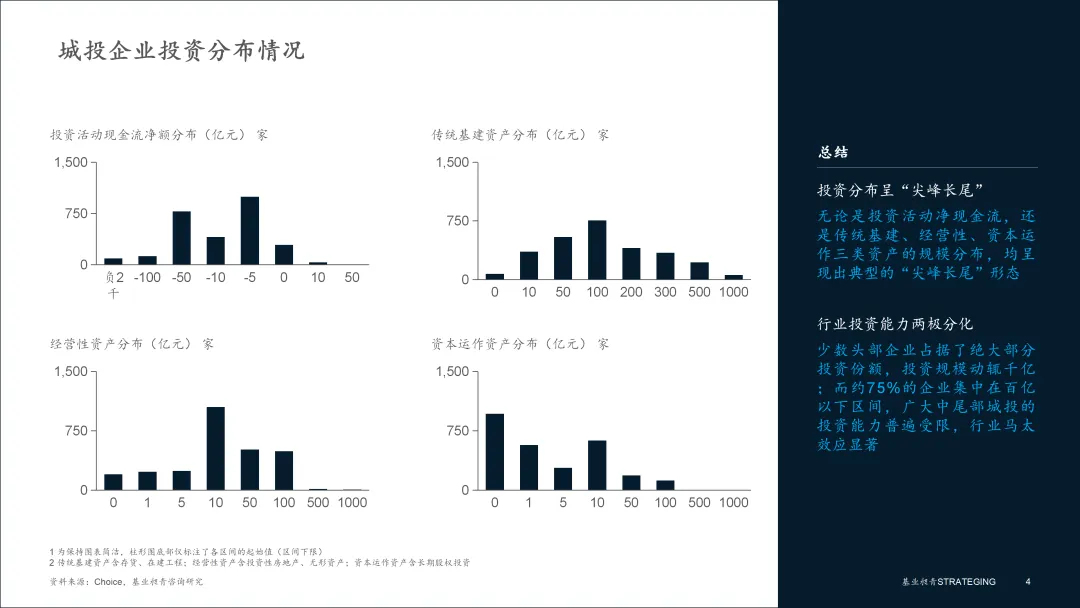 ▪ 传统基建资产分布:行业的基本盘。超过70%的企业 (约2000家) 的传统基建资产集中在10亿元至300亿元的区间。这揭示了以土地整理和项目建设为核心的传统业务模式,仍是构成城投行业主体的“基本盘”,其分布形态与企业的规模分布高度一致。