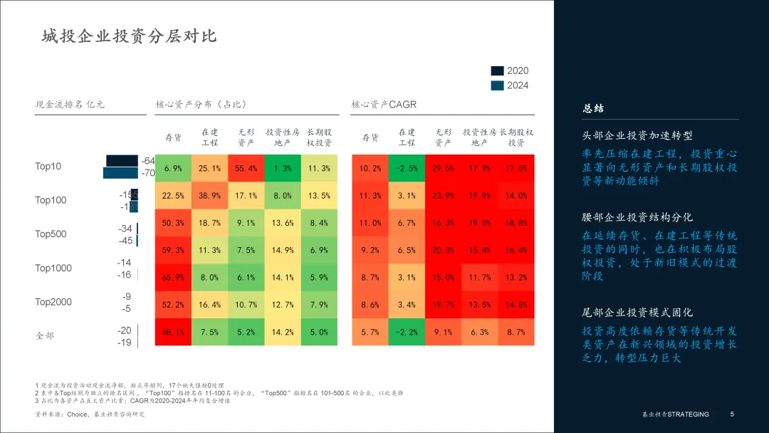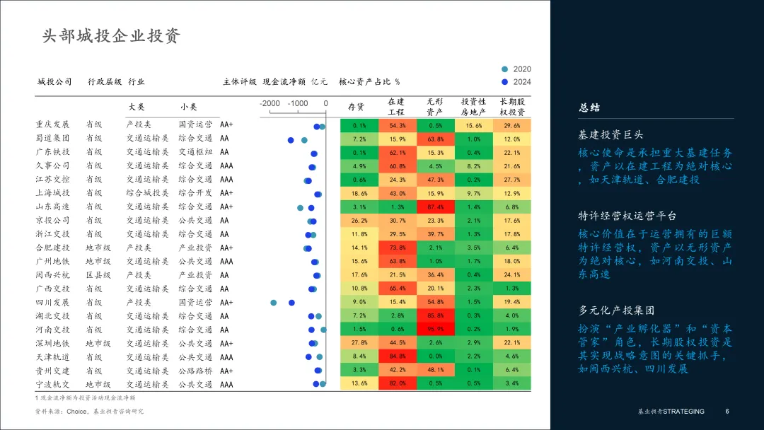 头部城投企业的投资策略分化,本质上是其核心功能定位与区域发展使命的直接映射。Top20企业以省级和核心地市级平台为主,是区域发展的绝对引擎,2024年投资净额合计超过-9600亿元。然而,其内部资产结构差异悬殊,从在建工程占比超80%的建设先锋,到无形资产占比超90%的运营巨头,清晰地展现了不同的发展路径。