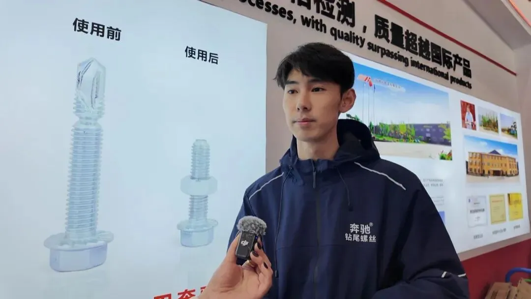 我们今年生产新的钻头扭剪螺丝,省时省力省人工,免焊接、免打孔,不需要钻头去打孔。前端是钻头,后端是螺栓,也可当钻尾丝使用。很荣幸参展,这次展会人特别多人流量也大,想借此机会把新产品推销出去。