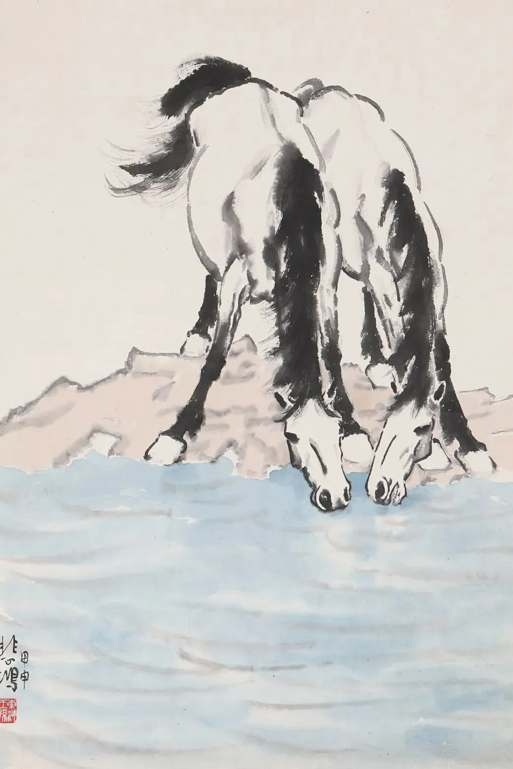 徐悲鸿先生一生创作颇丰,其中尤以马入画为世人所津津乐道。他笔下之马别具一格:体形瘦长,鼻孔张的很大,腿修长,蹄宽大。马头部常留有一道空白,或施一笔白粉,表现出马头部的高光;马的腹部以一笔勾画,弧线粗重,富有弹性,表现出肌肉的力度;马的鬣毛以浓墨渲染;马的尾部通过浓淡、干湿互衬的墨气表现出迎风飘曳的动态美等等。此画作于1944年(甲申年),正是徐悲鸿创作的成熟期。该画以线条勾勒为主,寥寥几笔,两匹饮水骏马便跃然纸上。双马在造型组合上形成一个并排并头,垂首饮水之势,如同情侣一般亲密无间。碧波荡漾的水纹,赭红颜色的土岸又给画面增添了丰富的色调,使此画充满了强烈的南国水乡气息。徐悲鸿能画出如此生动的画作,完全是得益于他坚实的造型能力和丰富的生活经历。