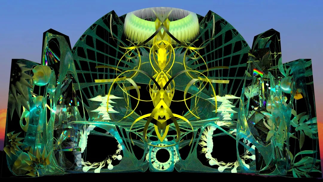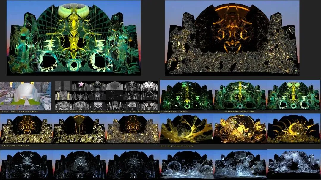 该作品以中国五行哲学元素(金,水,木,火,土)为主要叙事背景,昆虫为叙事主体,以微观视角为观看角度,通过光影艺术解构昆虫的独特视角以及与自然界交织。最终以外立面 mapping 数字壁画光影秀的形式对建筑模型进行模拟上墙实验。