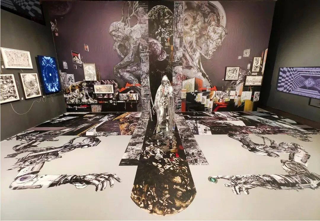 本作品作为一件大型空间壁画,包括墙面、地面、四周空间,旨在将整个展厅转化为硅基生命的“孵化场”。壁画突破平面限制,结合现场装置,影像播放,营造出强烈的沉浸感。