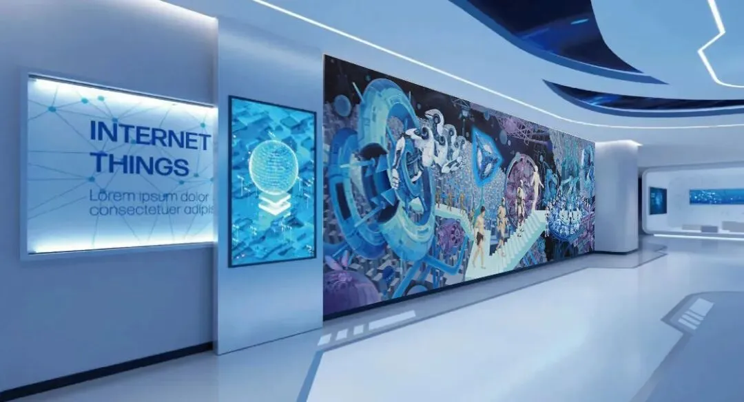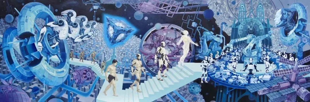 而人工智能对当今发展的重要性及人类未来的意义越发显著,它渗入到生活的方方面面,其不断更新对人与世界及其关系的理解,以及科技本身的哲学概念也为艺术的多元生长提供养分。科技题材壁画通过生动的图像和丰富的色彩,展现了科技领域的前沿技术和创新成果,引起观众视觉上的震撼和美感享受。观众在欣赏这些壁画的过程中,既能够感受到科技的魅力和惊人之处,也能够感受到艺术的独特魅力和表现力。壁画不仅仅是对科技知识的普及和宣传,更是一种引导观众审美情趣、培养审美能力的重要手段。