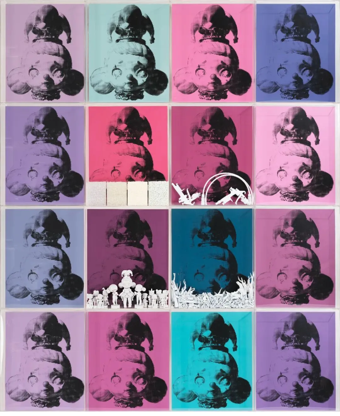 中国制造为潮玩产业发展提供支撑,同时潮玩也在促进文化传播;而东莞被誉为“中国潮玩之都”,全球1/4的潮玩均由东莞制造。本作品试图以丝网版画的"复数性”贴合潮玩批量生产之属性,并通过从原料、工具、成品等多面立体地展示当代制造业之美,旨在阐明“中国制造”的潮玩实现了从"代工”向"原创”的转变,进一步提升“中国制造”的形象和附加值,为文化自信赋能。