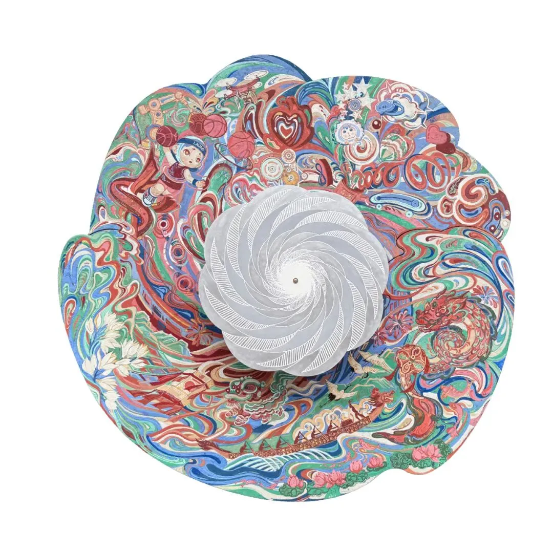 漩涡状的构图与动态装置,象征“东莞潮玩”永动向前。以东莞千角灯、龙舞、龙舟等传统非遗为代表的“早古潮玩”,与东莞现代潮玩代表“篮球劳拉”以及盲盒、机械臂、无人机等东莞智造,共同卷入绚丽多彩的时空隧道。“陶瓷×岩彩”的动态壁画落地于东莞龙头工业园区,阐释了企业创新的精神与文化,为园区注入活力!