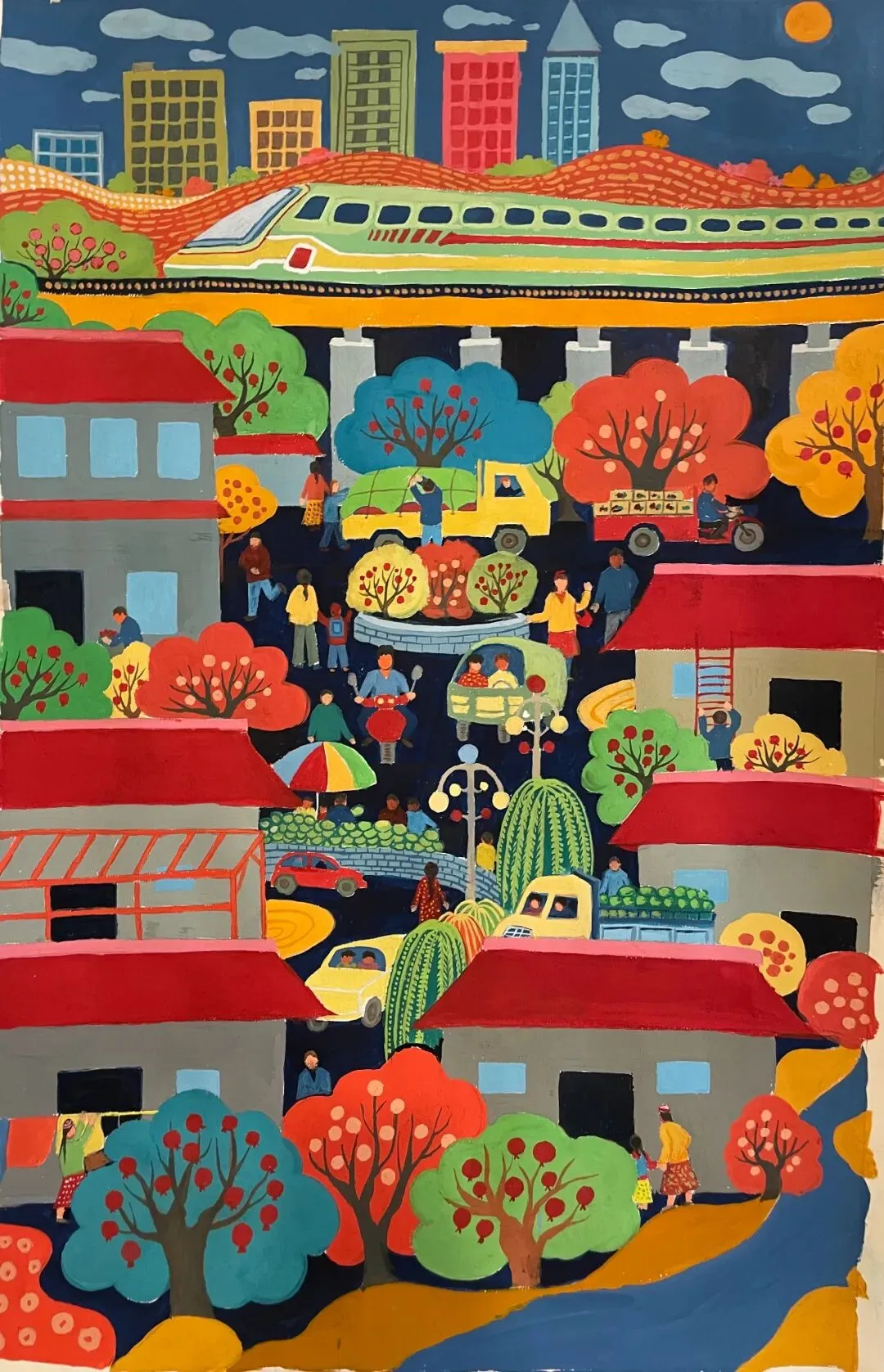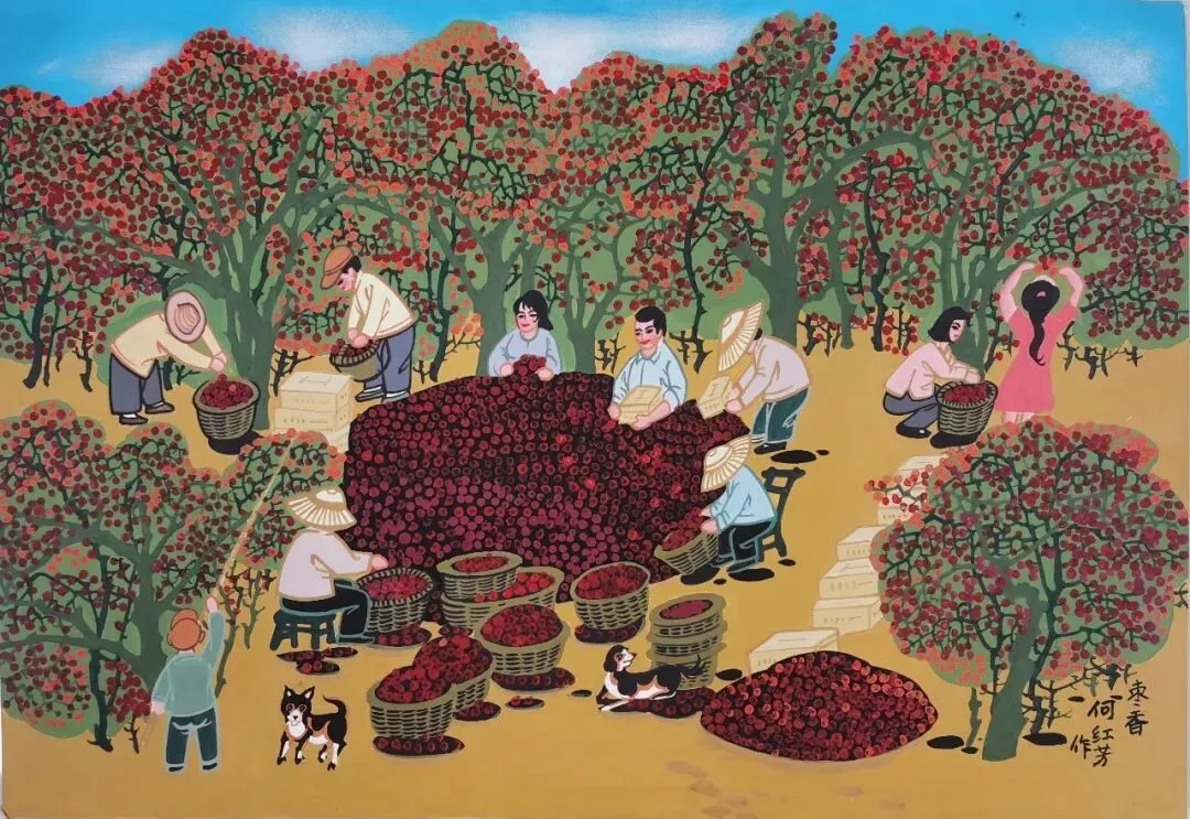 中国农民画并非“横空出世”。它深植于剪纸、刺绣、皮影、雕刻、年画等民间母体艺术,是稻麦气息与手工温度的当代延伸。20 世纪 50 年代,江苏邳县(今邳州市)、河北束鹿(今辛集市)、陕西户县(今西安鄠邑区)等地率先把“拿锄头的手”引向纸面,由此掀起一场持续数十年的农民画浪潮。红高粱、金麦浪、鸡鸣犬吠、袅袅炊烟……从未进过美院的作者,以朴拙之形、炽热之色,记录下乡土中国的呼吸与心跳。