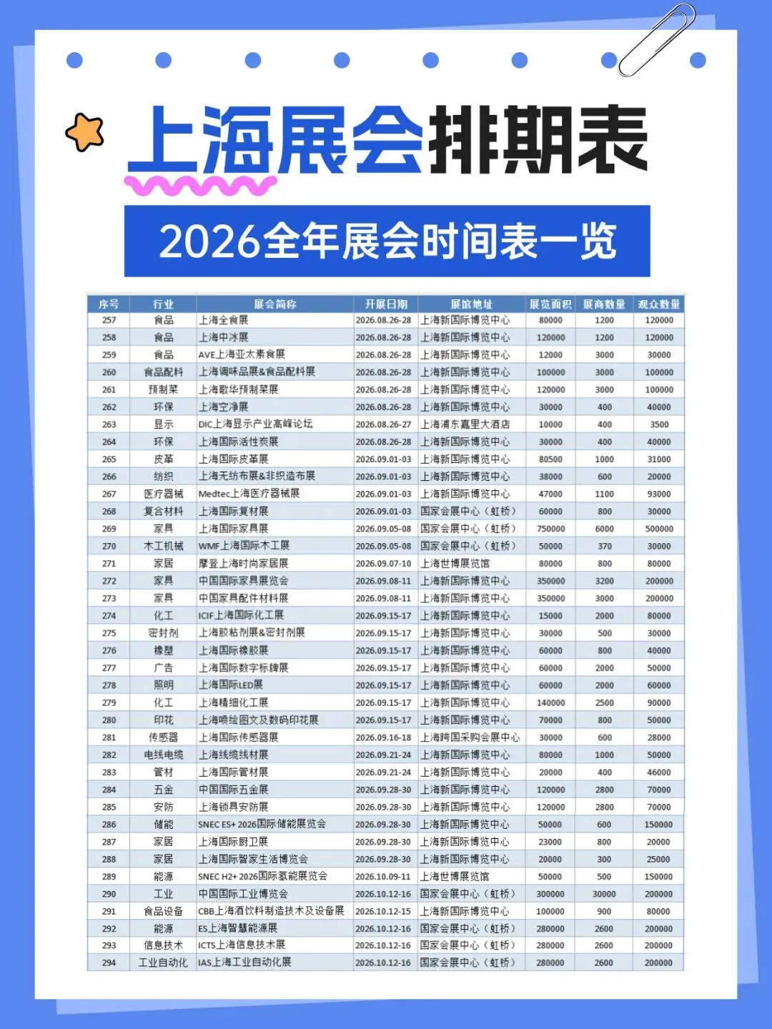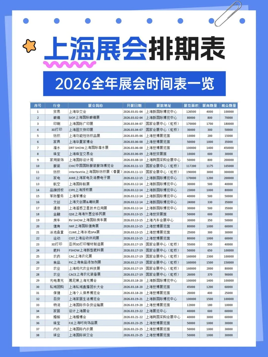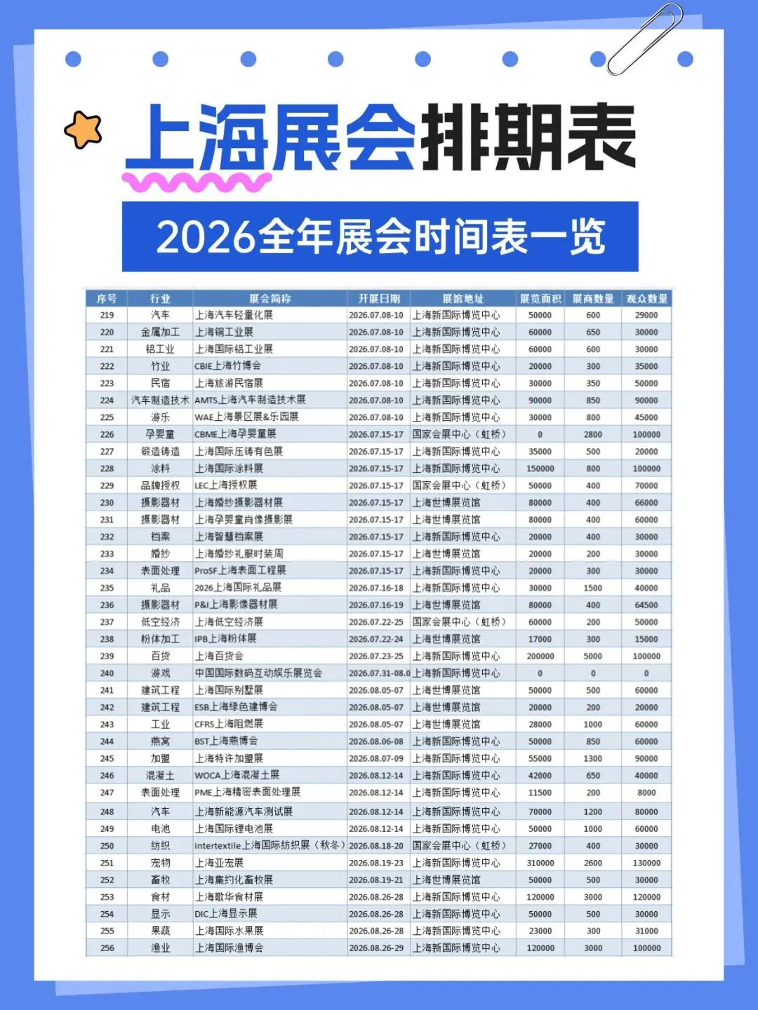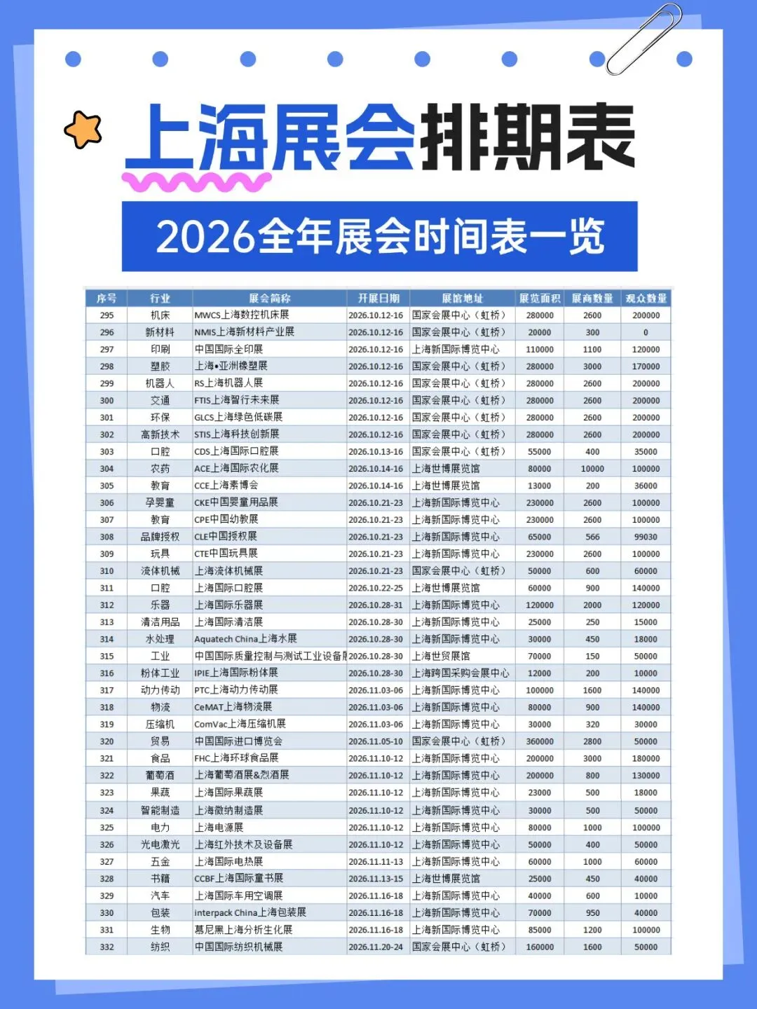 2026年上海将举办多场各行业展会,涵盖了百货、婚嫁、珠宝、袜业、帽子、家居、粉体加工、电机、运动、钓具、旅游、餐饮、家具、酒店用品、清洁用品、环保、物流、医药、美容、校服园服、纺织、服装、食品、烘焙、电子、水处理、管材、泵阀、环保、食品配料、保健、汽车、金属加工、铝工业、孕婴童、礼品、百货、燕窝、渔业、医疗器械、五金、教育、品牌授权、玩具、口腔、动力传动、物流、压缩机、包装、食材、自有品牌、新材料等行业,小编已为大家整理好关于2026上海全年展会(最新版)请查收,助你高效逛展。关注【展会全地图】公众号,发送【上海】