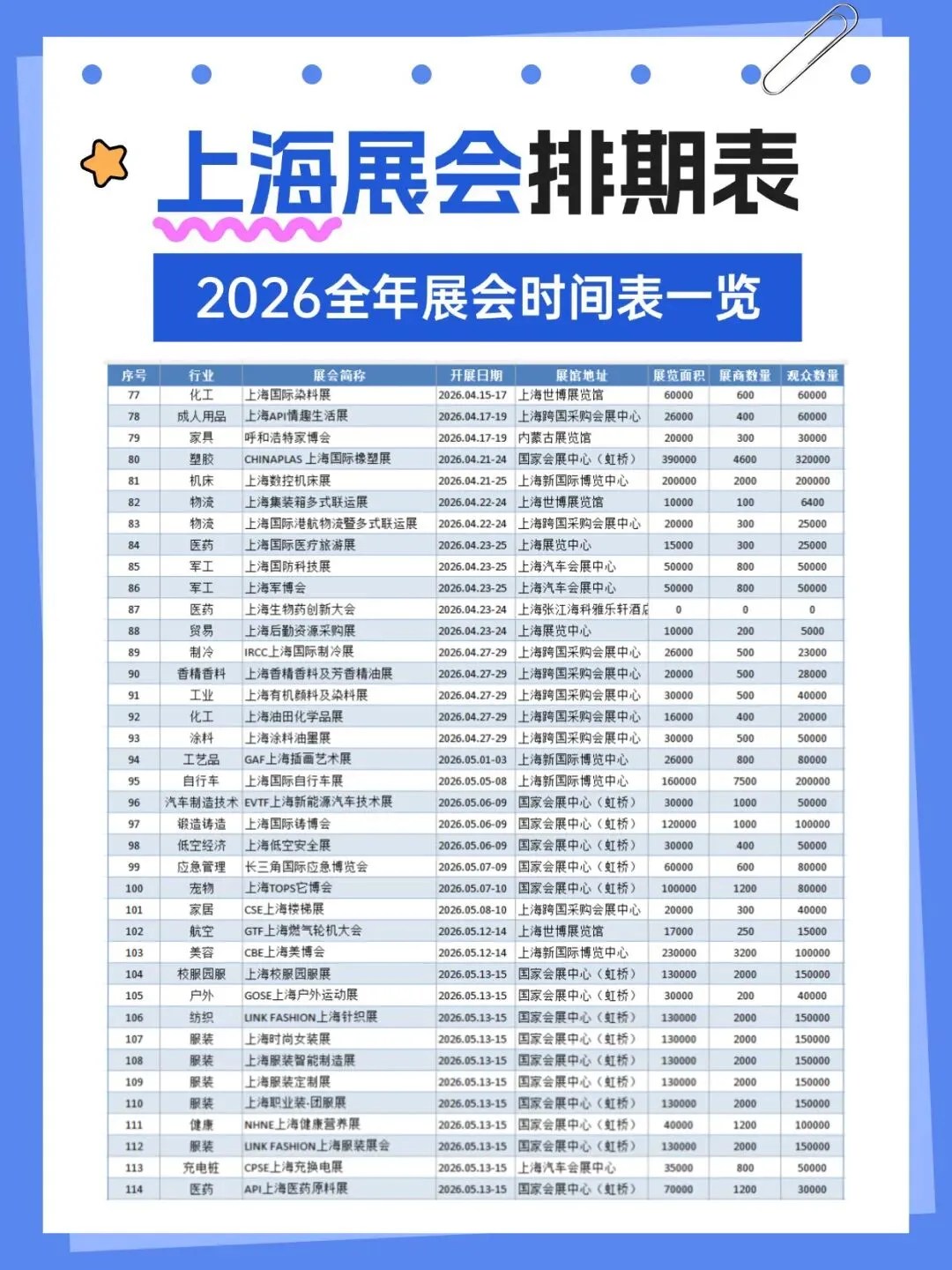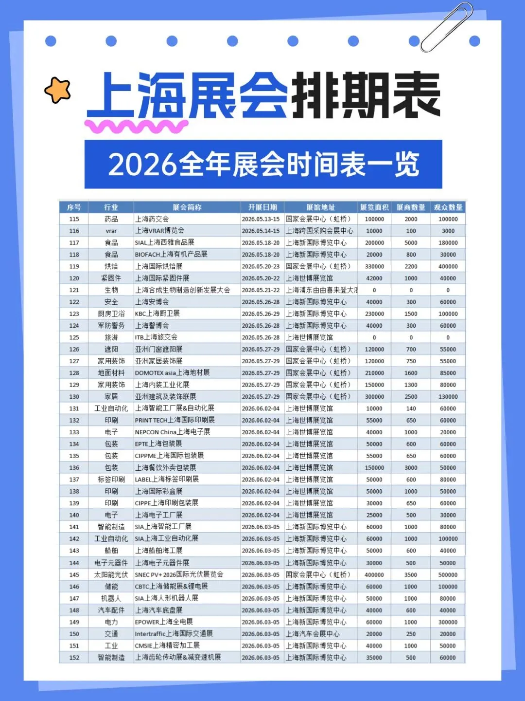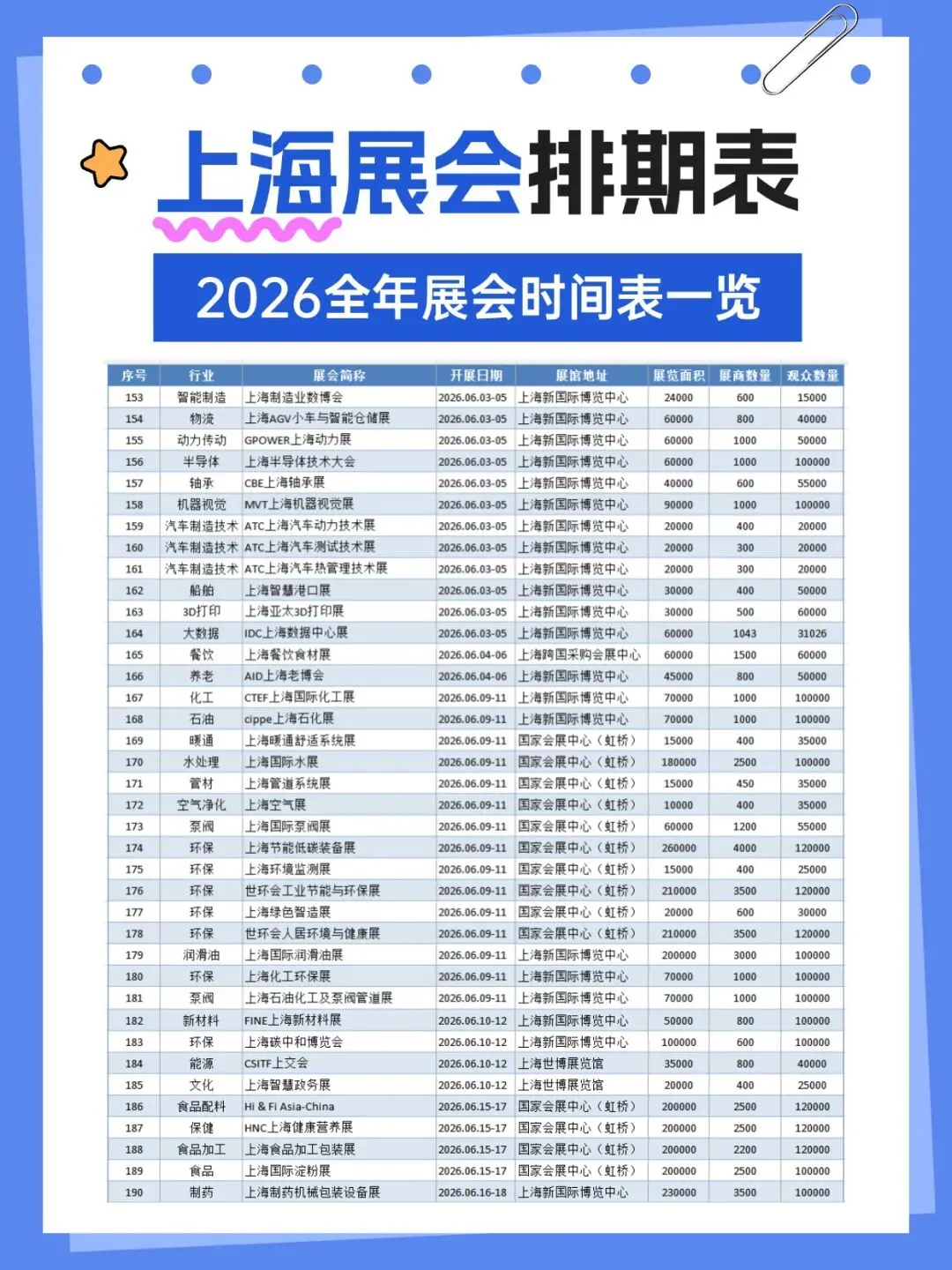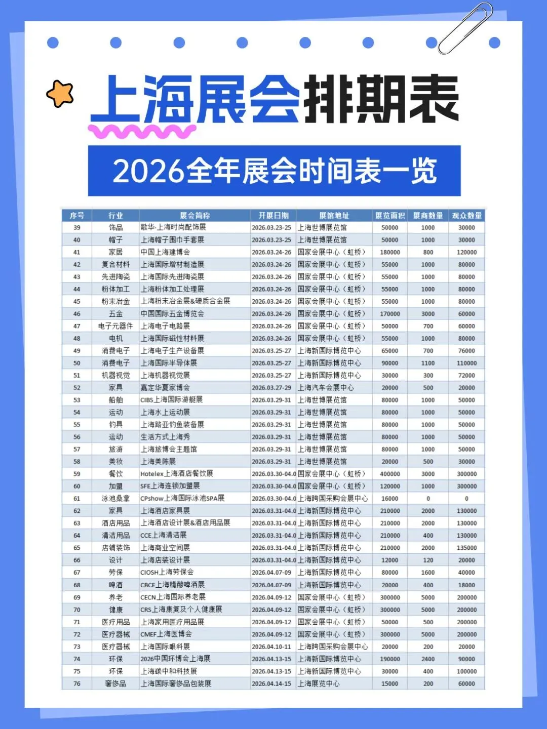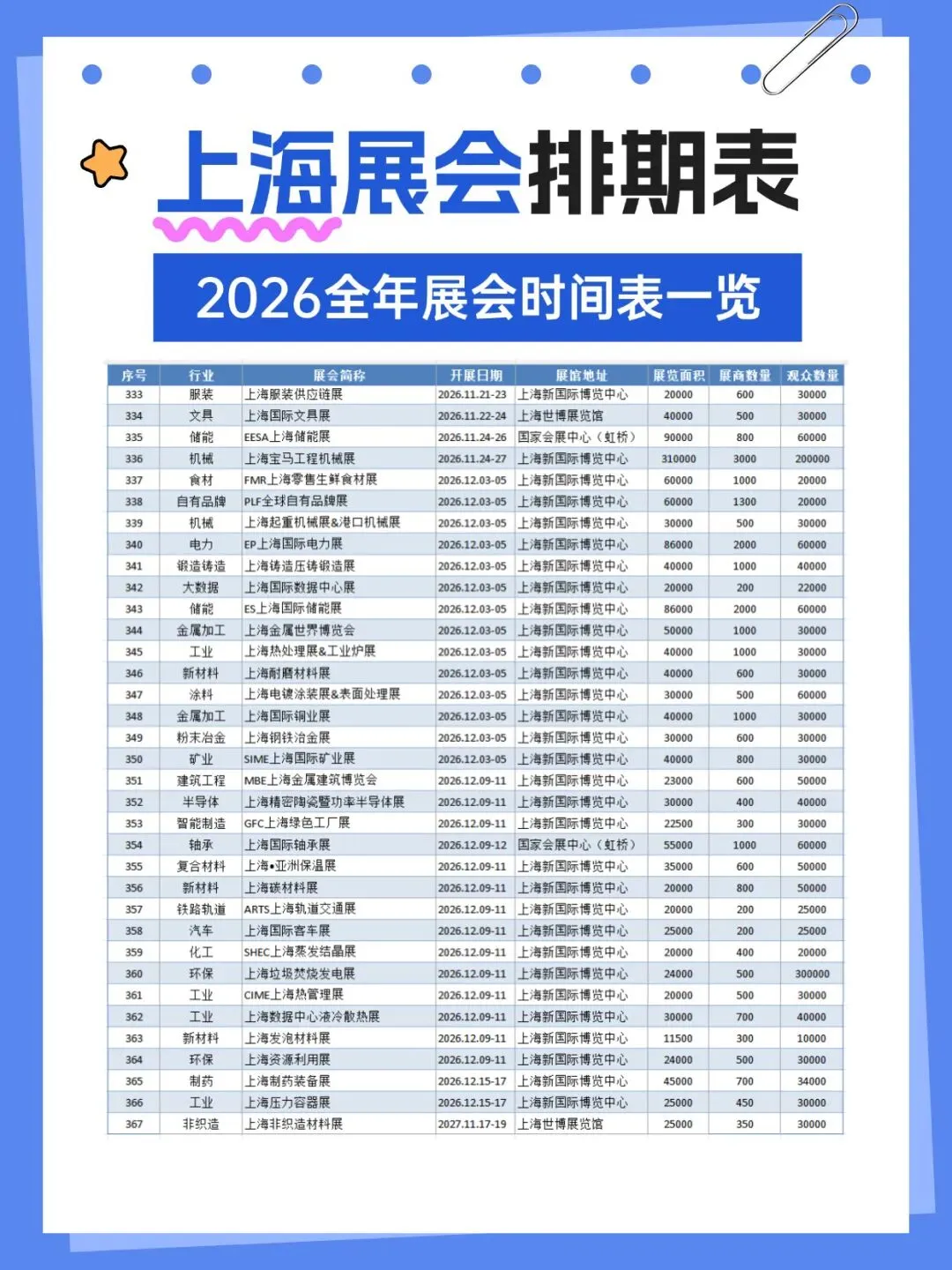 2026年上海将举办多场各行业展会,涵盖了百货、婚嫁、珠宝、袜业、帽子、家居、粉体加工、电机、运动、钓具、旅游、餐饮、家具、酒店用品、清洁用品、环保、物流、医药、美容、校服园服、纺织、服装、食品、烘焙、电子、水处理、管材、泵阀、环保、食品配料、保健、汽车、金属加工、铝工业、孕婴童、礼品、百货、燕窝、渔业、医疗器械、五金、教育、品牌授权、玩具、口腔、动力传动、物流、压缩机、包装、食材、自有品牌、新材料等行业,小编已为大家整理好关于2026上海全年展会(最新版)请查收,助你高效逛展。关注【展会全地图】公众号,发送【上海】