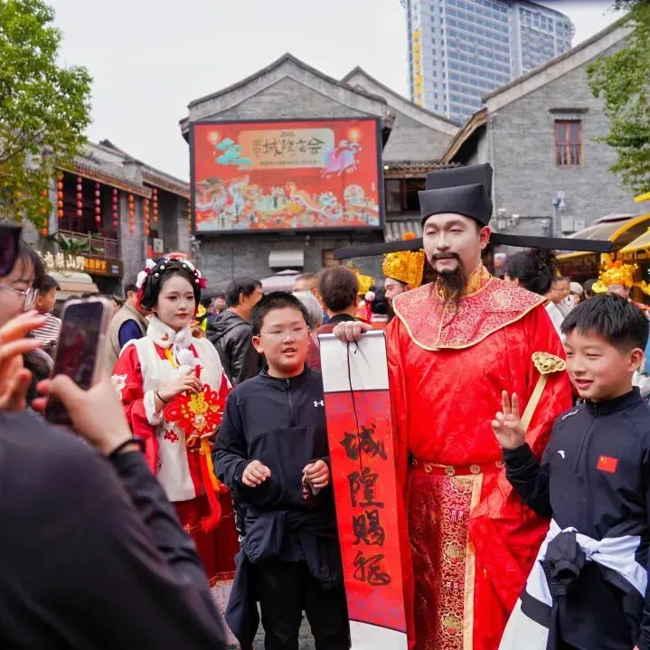 正月初一清晨,钟鼓楼撞钟仪式拉开春节序幕。这座始建于明代的古建筑在晨光中迎来36位各行各业先进人物代表,108声钟响回荡古城,寓意驱散烦恼、祈福新年,也蕴含四季、二十四节气、七十二候的文化深意。钟声过后,城隍庙广场舞龙舞狮腾跃而起,瑞狮祥龙穿梭人群,瞬间拉满新春热力值;正月初五,“城隍送福巡游”成为重头戏。“城隍爷”穿行老街旧巷,与市民游客亲密互动、派送福礼,浓浓的年味让古城愈发生动。非遗文化创意市集里,地道小吃、传统手作摊位前人头攒动,游客们边逛边吃,近距离感受非遗匠心。