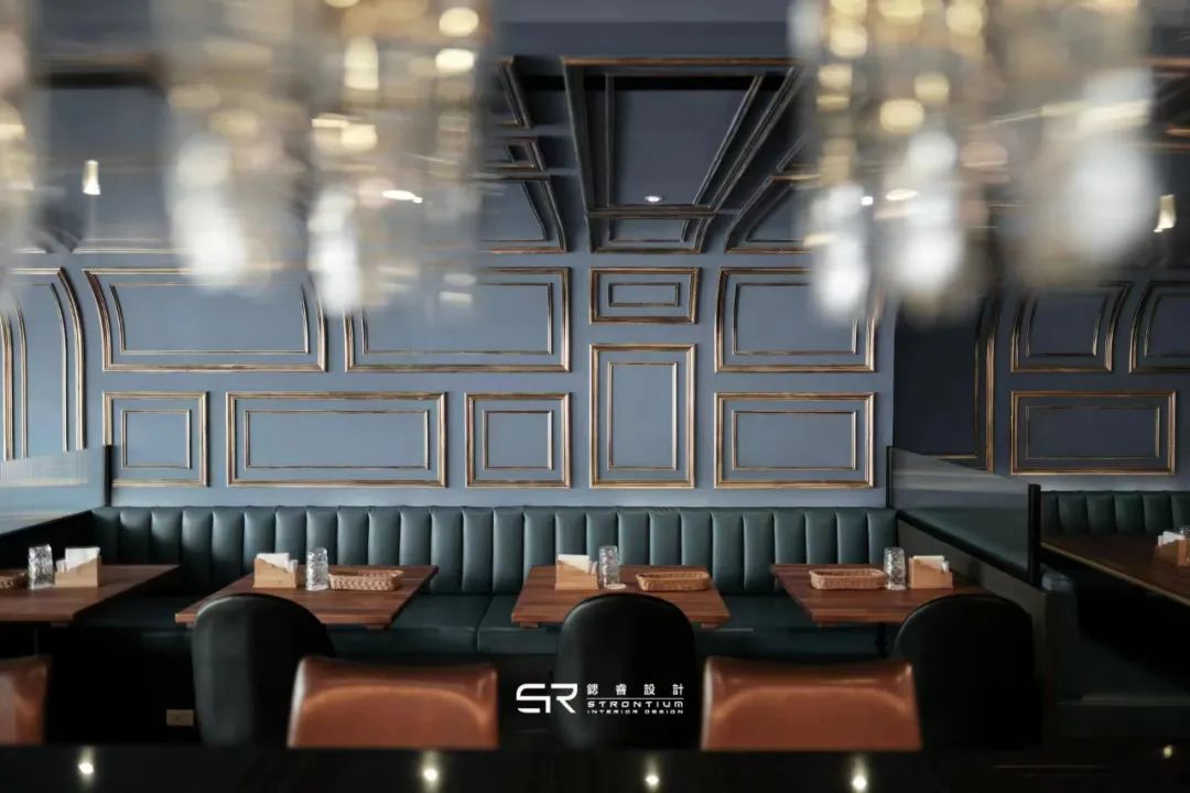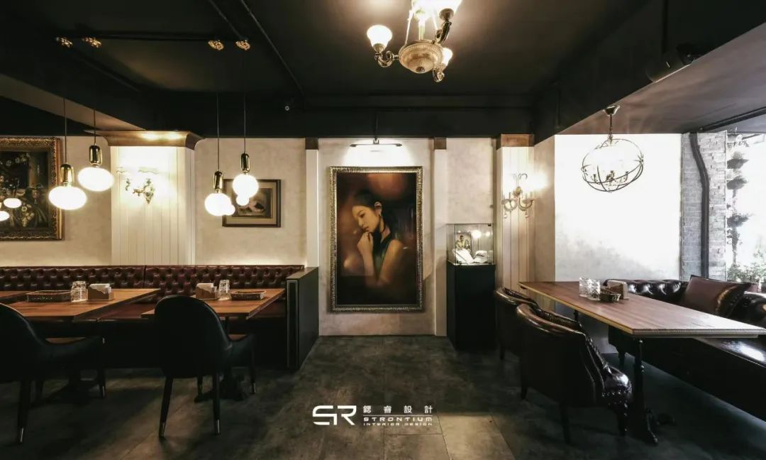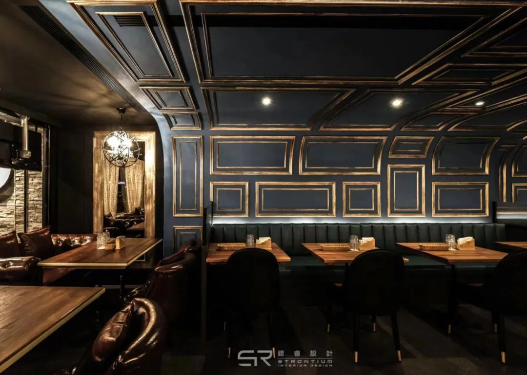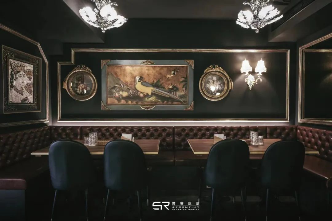 餐厅左侧用餐区,将金边古典线板从墙面延伸至天花板的设计手法,在视觉上融入超现实感;餐厅右侧用餐区使用强烈对比的黑白色突显业主收藏多年的 画作,增添室内空间的时尚及艺术感。星爸餐酒馆不仅是纯粹的古典风格,亦融入现代工业的元素引入用餐空间,彷佛置身欧洲艺廊。