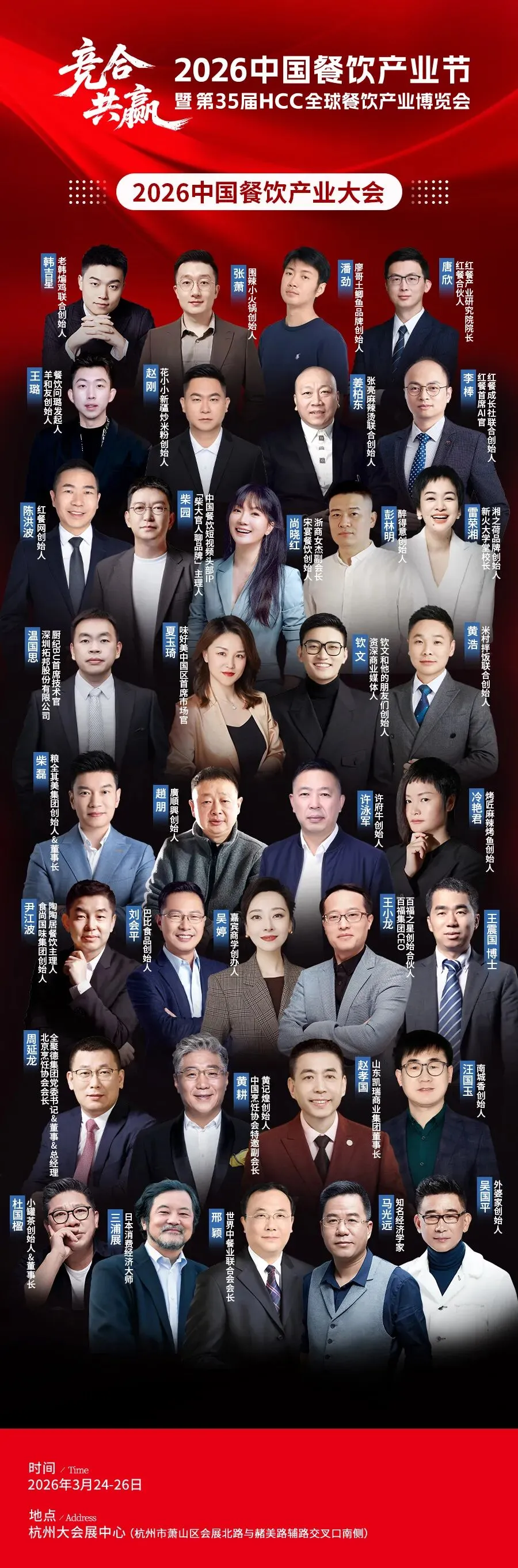 在此背景下,2026中国餐饮产业节暨第35届HCC全球餐饮产业博览会应运而生。本届产业节由世界中餐业联合会、红餐网联合主办,以“竞合·共赢”为主题,将于3月24-26日在杭州大会展中心举办。