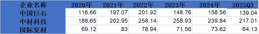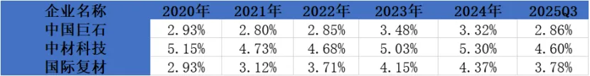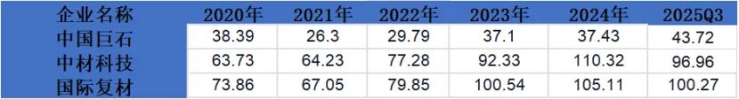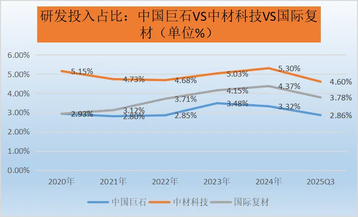 中国巨石和中材科技研发投入占比波动相对平稳,国际复材呈现出缓慢上升的趋势,说明国际复材在研发重视程度和投入力度上有逐渐加强的态势,而中国巨石和中材科技则保持相对稳定的研发投入策略。