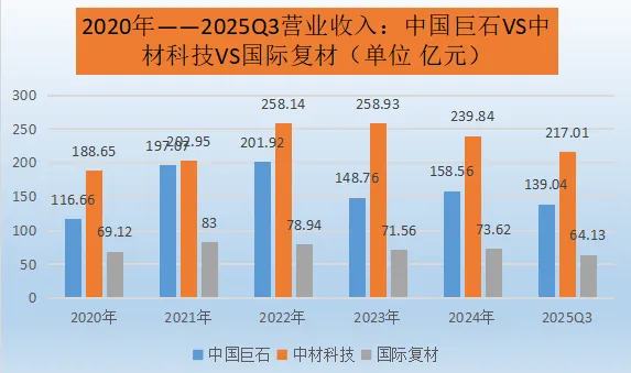 中材科技在多数年份营收规模最大,处于行业领先地位;中国巨石次之;国际复材规模相对较小。这反映出三家企业在市场地位和业务规模上存在一定差异。中国巨石营收波动幅度较大,增长的不确定性较高;中材科技增长相对稳定,但在2024年出现下滑;国际复材增长较为平稳但增速较慢。不同企业的增长特点反映了其各自的发展战略、市场策略和应对风险能力的不同。