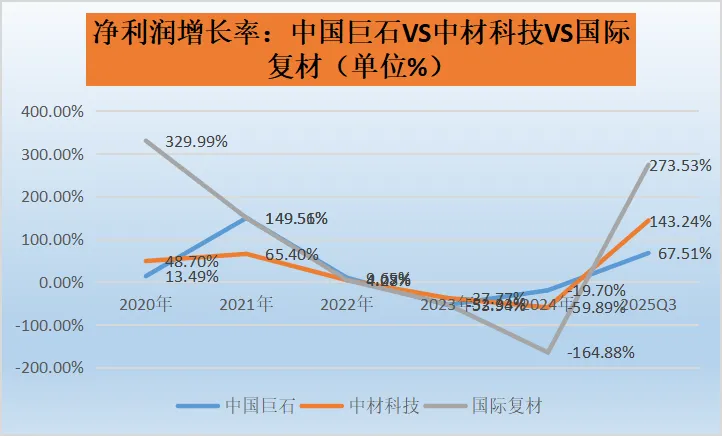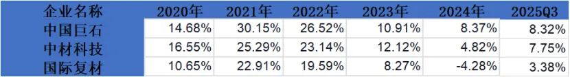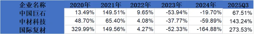 三家企业净利润增长均不稳定,但相对而言,在部分年份中材科技的增长波动幅度可能略小于其他两家,不过整体差异并不十分显著,都面临着较大的市场波动风险。在不同年份,三家企业的净利润增长幅度各有高低。例如2020年国际复材增长幅度远超其他两家,而2025年前三季度国际复材和中国巨石都实现了较高的正增长,中材科技也在该时期有较大幅度增长。这说明各企业在不同阶段具有不同的市场竞争力和盈利能力表现。