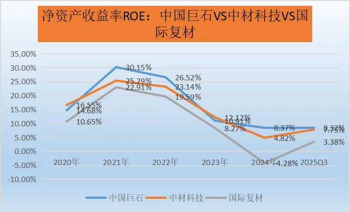 在不同年份,三家企业的净资产收益率高低有所不同。2020 - 2021年中材科技相对较高,显示出较强的资本获利能力;2021年后中国巨石在某些年份表现较好,但在后期也面临收益下滑压力;国际复材整体收益水平相对较低且波动较大。