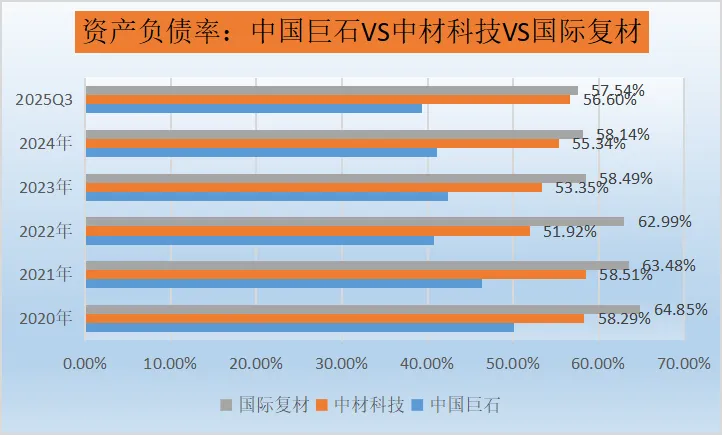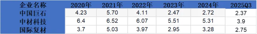 在各年份中,国际复材的资产负债率通常最高,中国巨石相对最低,中材科技处于中间水平。这表明国际复材在资本结构中债务占比较高,财务杠杆较大;中国巨石债务负担相对较轻,财务结构更为稳健;中材科技则介于两者之间。