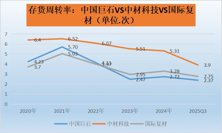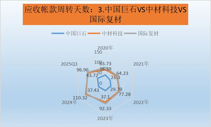 在各年份中,中国巨石的应收账款周转天数通常最短,说明其应收账款回收效率最高,资金回笼速度最快,在销售信用管理和客户收款方面具有较强优势;国际复材和中材科技周转天数相对较长,回收效率较低,尤其是中材科技和国际复材在后期周转天数超过90天甚至100天以上,资金占用情况较为严重。中国巨石波动较大但整体相对可控;中材科技呈现明显的上升趋势,应收账款管理压力逐渐增大;国际复材虽然相对稳定但也处于较高水平且略有上升,同样需要重视应收账款回收问题。