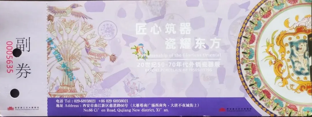 这是一张西安曲江艺术博物馆“匠心筑器 瓷耀东方——20世纪50-70年代外销瓷器展”门票,门票上打印的时间是2025年3月24日,地点是西安市曲江新区慈恩路66号,左侧打了两个孔,说明是使用过的门票。