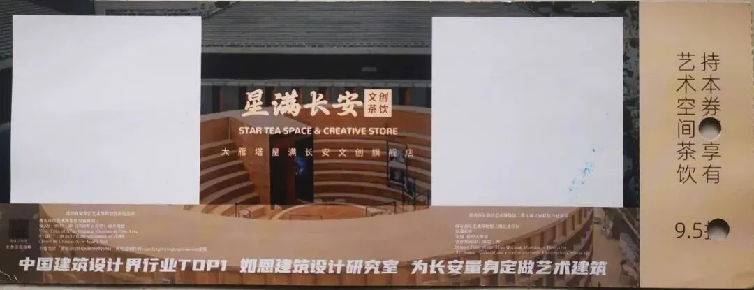门票背面是“星满长安园文创茶饮”,右侧文字持本券享有艺术空间茶饮9.5折文字,门票上有两个打孔,说明游客既参观展览,又品茶消费。