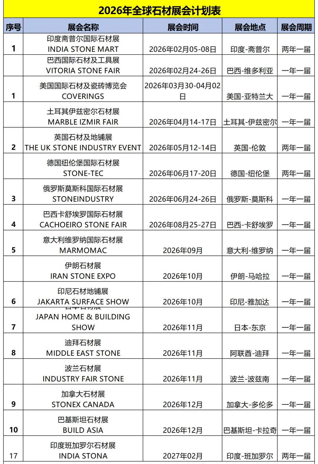 2026年全球石材展会计划表
