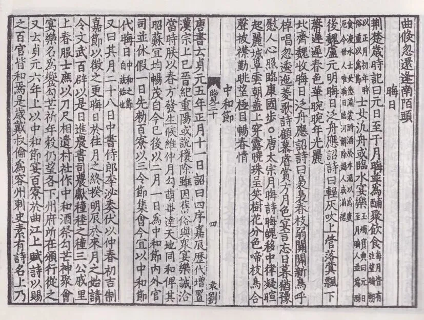 四序嘉辰,歷代增置。漢崇上巳,晉紀重陽。或說禳除,雖因舊俗,與衆共樂,咸合當時。朕以春方發生,候及仲月,勾萌畢達。天地和同,俾其昭蘇,宜助暢茂。自今宜以二月一日爲中和節,以代正月晦日,備三令節數,內外官司休假一日。(《舊唐書·德宗紀》)