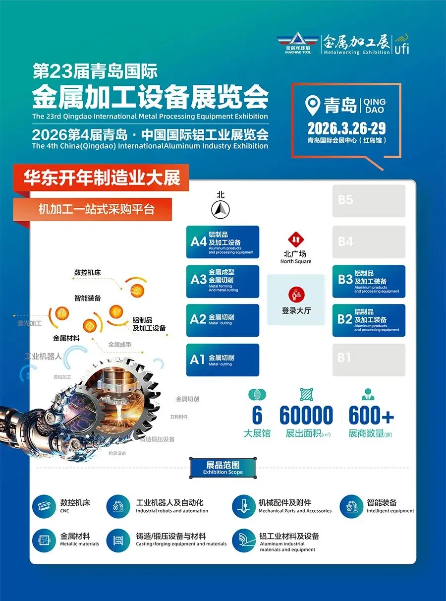 2026第23届青岛国际金属加工设备展暨第4届青岛·中国国际铝工业展定档2026年3月26-29日,作为华东地区开春大展,此次展览会重点展出金属切削、金属成型、工业自动化及机器人、机械附件及配件、智能装备、金属材料、铝工业材料及设备等,全面助力智造行业资源共享、专注供需、高效业务链接,推动产业转型升级,着眼打造金属加工领域全产业链中国集采平台。
