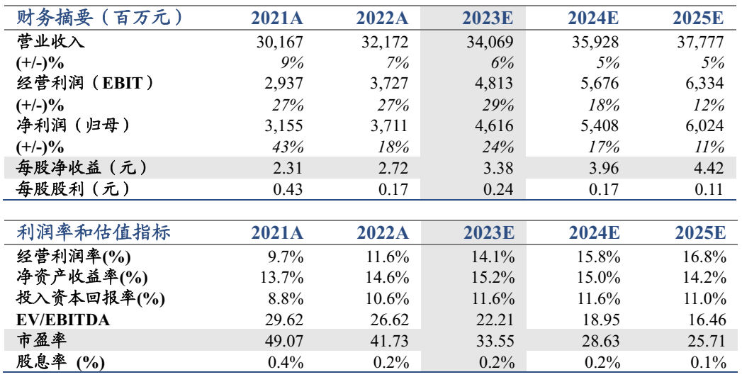 投资建议:维持2023-25年盈利预测EPS至3.38、3.96、4.42元,目前股价对应2023年PE 34X,维持目标价140元,维持“增持”评级。