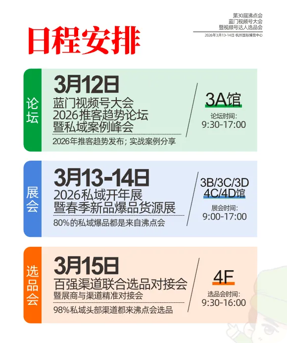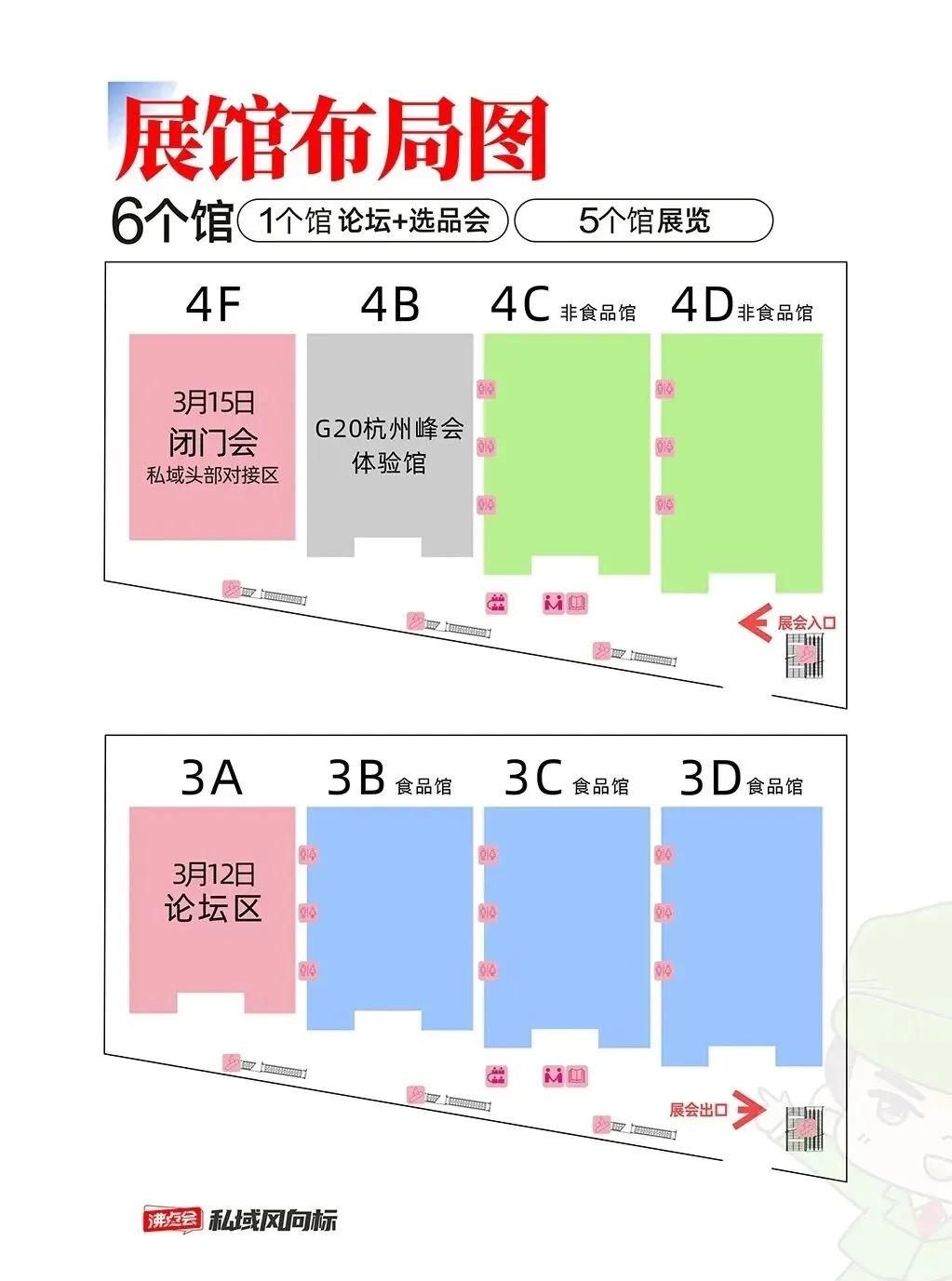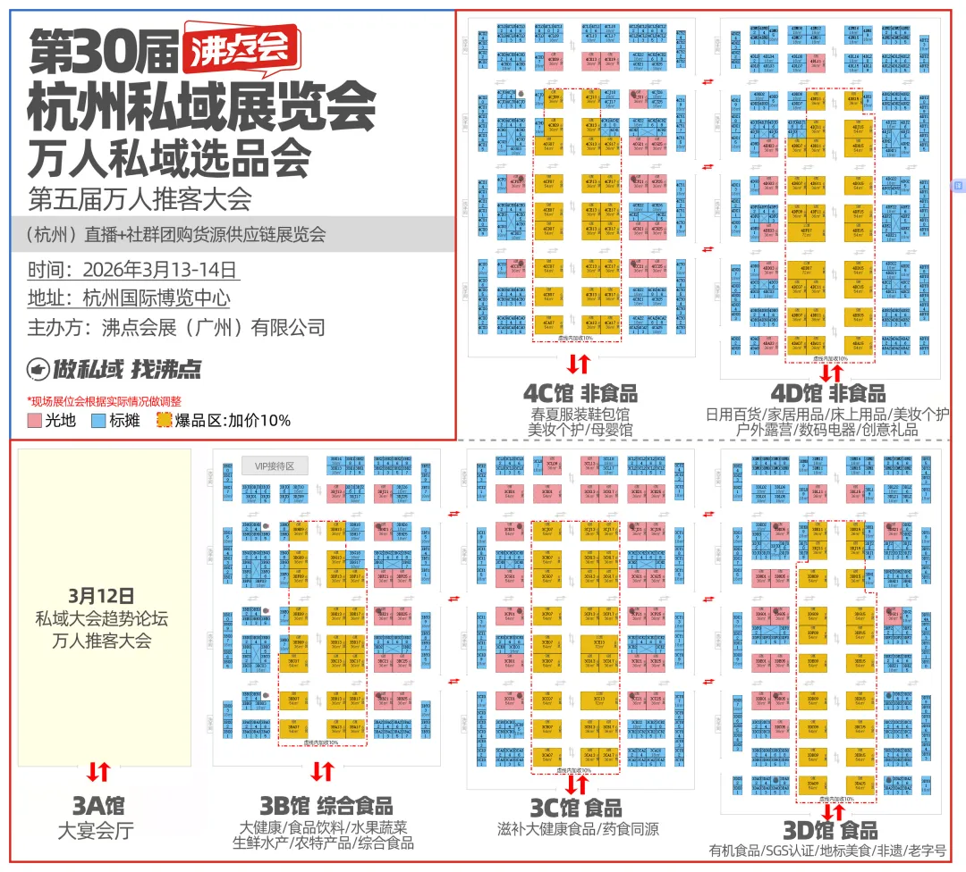 ✅ 3 月 13-14 日:私域爆品货源展 + 私域团长选品会5 大展馆(3B/3C/3D/4C/4D)全面开放!1000 + 展商携万款新品爆品集中亮相,98% 私域头部渠道现场坐镇选品,面对面洽谈合作,高效达成供需匹配。