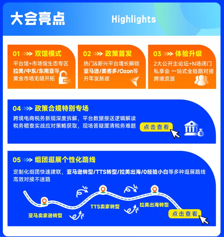开年跨境首展,平台重点战略首发、跨境资源对接、新兴市场无缝衔接、海量资源无缝衔接、新兴平台增长指南、财税合规破局分享、行业趋势深度解析、跨境链路快速打通,实现全球平台直招不排队,资源主动找上门!