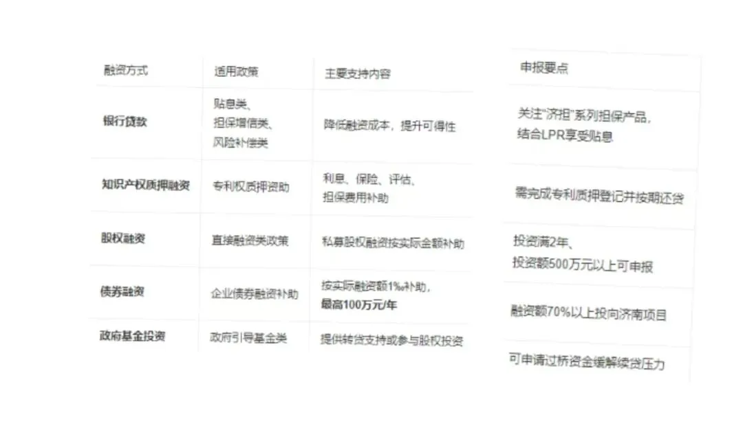 适用政策:中小微企业贷款风险补偿、创业担保贷款贴息设立20亿元风险补偿资金池,对中小微企业贷款不良按比例补偿,首笔贷、纯信用贷补偿比例提高10个百分点;匹配建议:适用于缺乏抵押物但信用良好的小微企业,可联合银行申请“济担—信心提振贷”等产品。二、按融资方式匹配政策