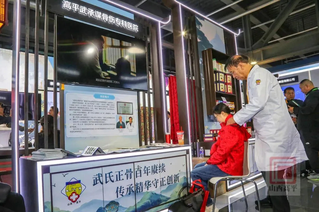 高平武氏正骨疗法,作为国家级非物质文化遗产保护项目,是一门传统中医骨伤科疗法。参展中,武氏正骨第三代传承人武天宝正在为参观者讲解正骨疗法,并教大家如何缓解日常生活中出现的疼痛。