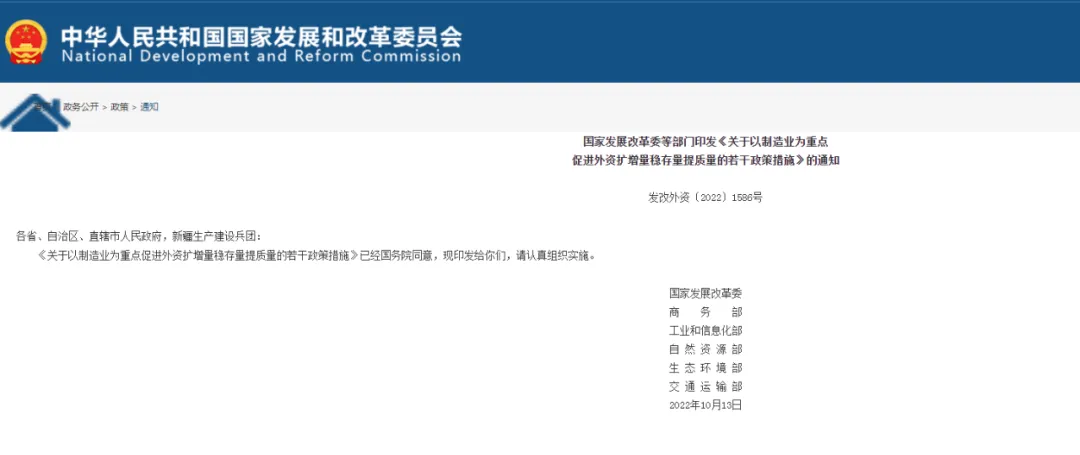 10月25日,国家发改委等六部门印发《关于以制造业为重点促进外资扩增量稳存量提质量的若干政策措施》,其中提出,支持符合条件的外商投资企业通过在主板、科创板、创业板、北京证券交易所上市,在新三板基础层和创新层挂牌,以及发行公司信用类债券进行融资。支持各类金融机构在依法合规、风险可控前提下创新产品和服务,按照市场化原则为符合条件的外商投资企业提供优质金融服务和融资支持。鼓励各地依法与各政策性银行、大型银行、股份制银行等金融机构共享制造业外商投资企业和项目信息,定期举办“银企对接”活动。