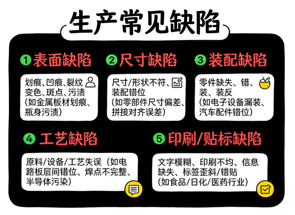 在实际生产中,产品缺陷的表现形式多种多样,涵盖从表面外观到结构装配的各个维度,而计算机视觉技术能对各类缺陷实现全覆盖识别,主要分为五大类: