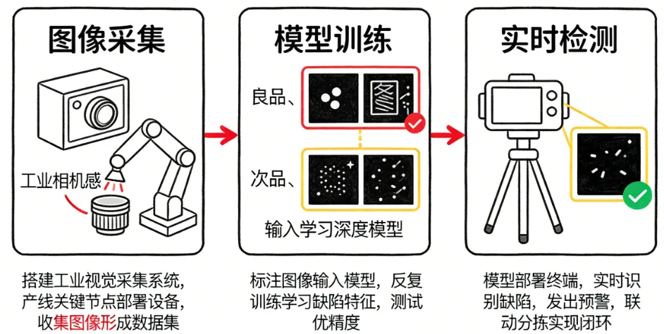 视觉AI缺陷检测系统并非单一的技术模块,而是图像采集、模型训练、实时检测、缺陷预警的一体化流程,适配各类产线的实际需求,核心步骤分为三步: