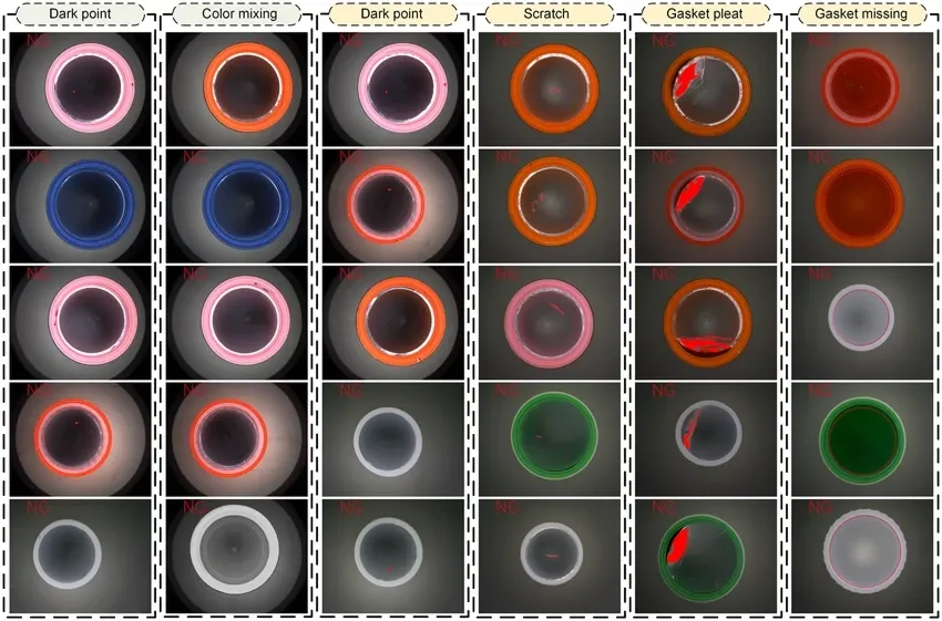 以瓶盖质检为例,不同尺寸、颜色的瓶盖在产线上快速移动,视觉AI系统能实时识别其表面的黑点、划痕、混色,以及垫片缺失、错位等结构缺陷,做到无漏检、无错检。