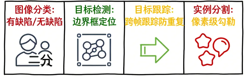 计算机视觉最基础的任务,仅对图像进行“有缺陷/无缺陷”的二分类判断,适用于缺陷特征明显、只需快速筛除次品的简单场景,检测速度最快。