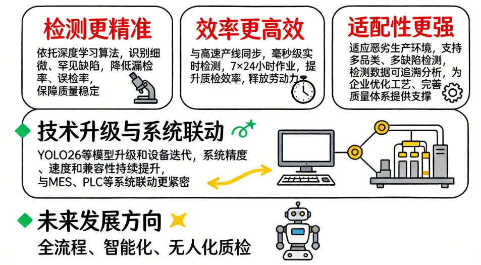 随着YOLO26等深度学习模型的不断升级,以及工业视觉设备的迭代,视觉AI缺陷检测系统的精度、速度和兼容性还将持续提升,与MES、PLC等产线系统的联动也会更加紧密。