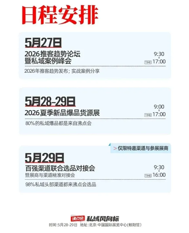 继2025年10月北京站引爆行业热潮,我们趁热北上,定档2026年5月!避开深秋寒意,相聚初夏北京,在温暖时节再续私域盛事,再启北上选品盛宴。
