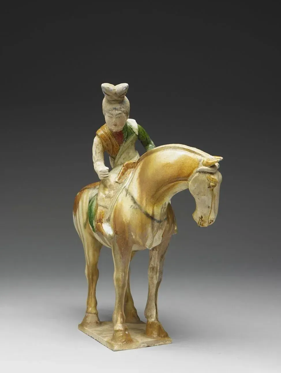 马球源于波斯,唐代盛行于宫廷与贵族之间,既是竞技,也是礼仪与娱乐的融合。此俑展现了唐代女性参与马术运动的英姿,更体现了马从战场走向赛场、从武力转向文化的生动过渡。在这里,奔马不再是征伐的工具,更是承载力与美的象征。