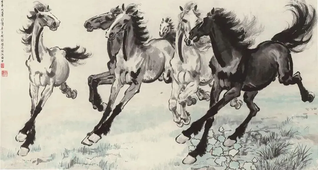 取材于汉武帝所作乐府歌辞《天马歌》,突显抵御匈奴、班师凯旋的雄浑气魄。该作品作于抗战时期,是对民族精神的有力呼唤。徐悲鸿以马喻人,以奔马之势激励国人奋进前行,将奔马之姿升华为一种文化意志与时代强音。