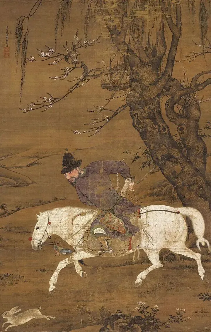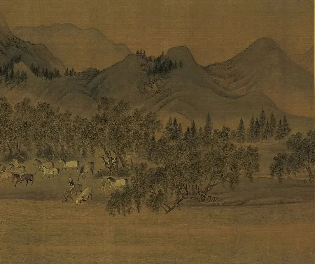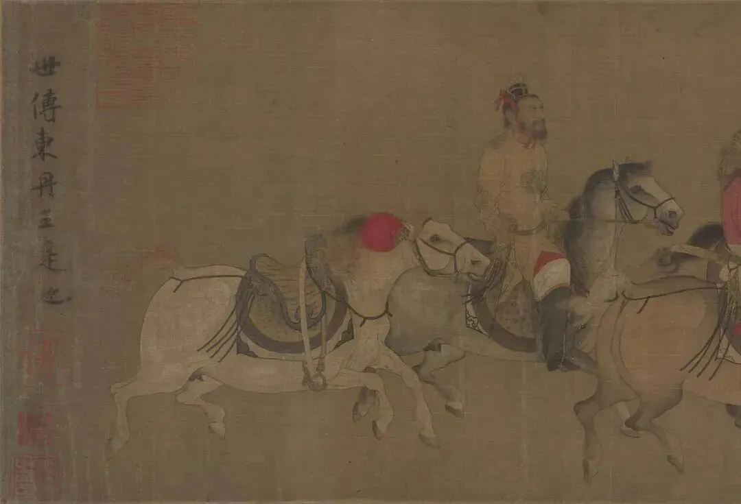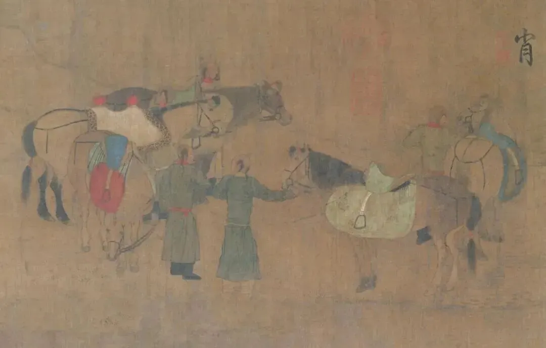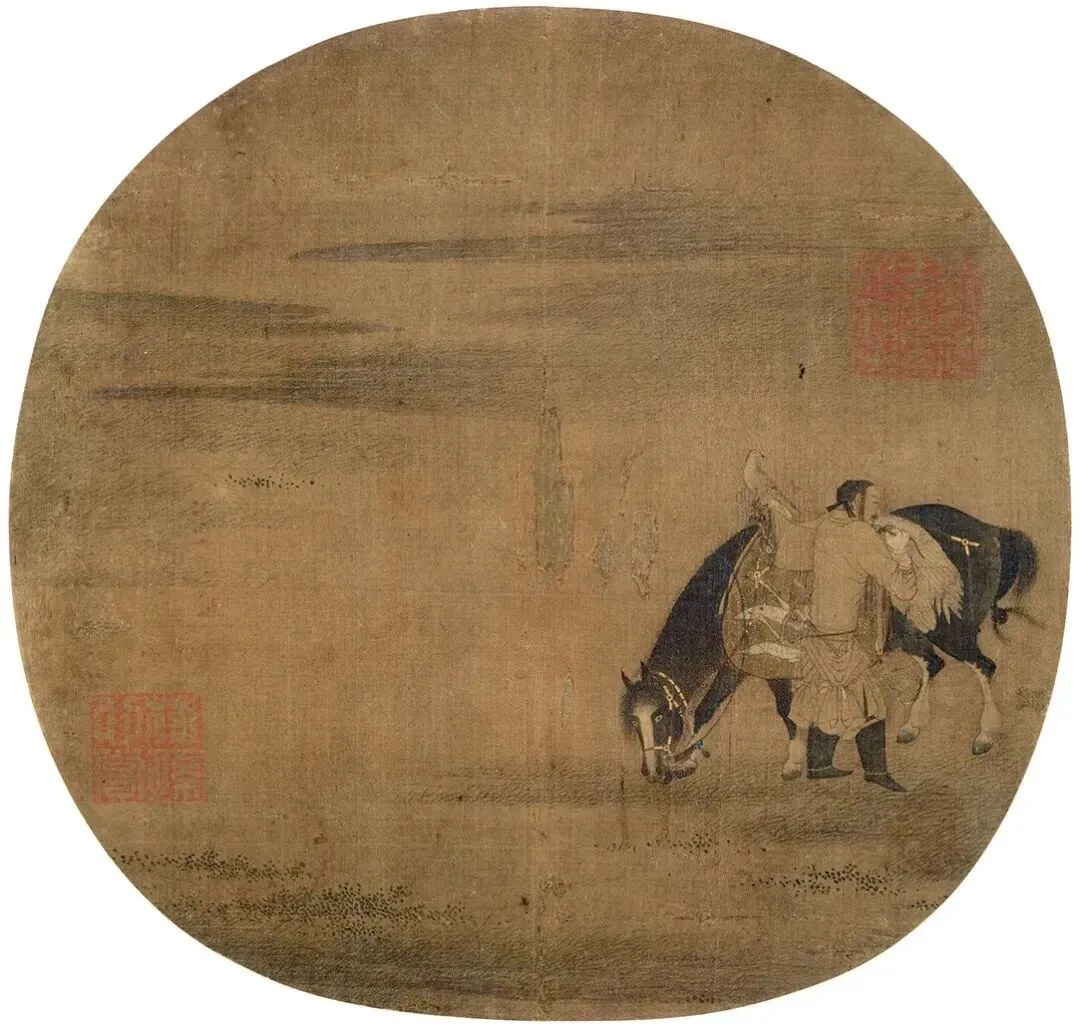 作者是辽代的贵族画家,人称东丹王,原名耶律倍,后来投奔后唐改名为李赞华。画面居中骑白马者应为他本人,其面容沉静微郁,似暗合其弃辽投唐后复杂心境,为画面增添一层深沉的情感维度。它让我们看见,无论在中原还是塞外,马始终是人们征途与归途中,那位静默而可靠的同行者。