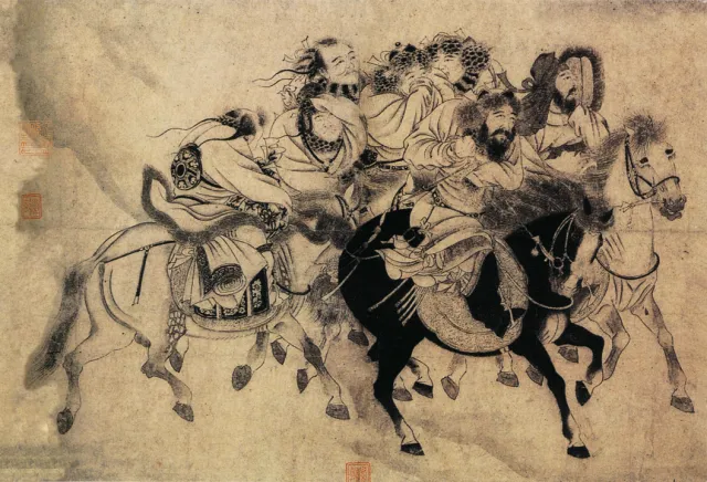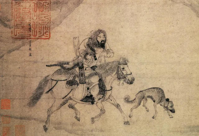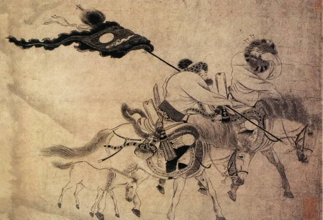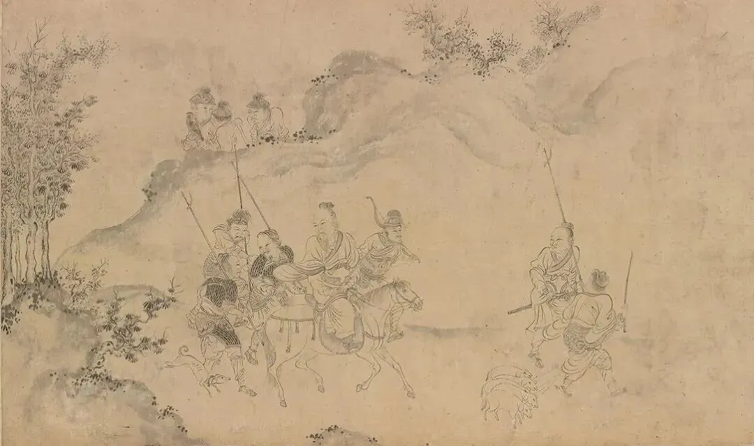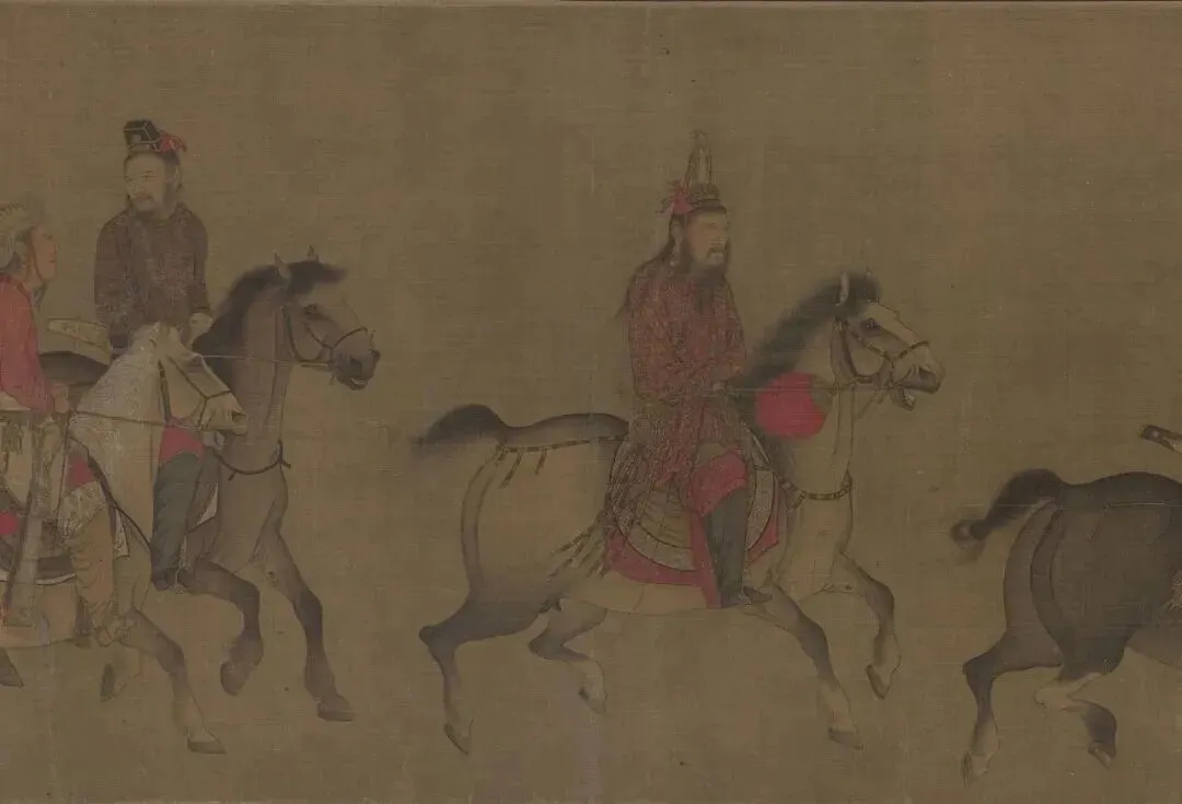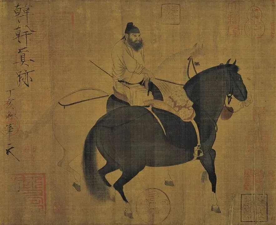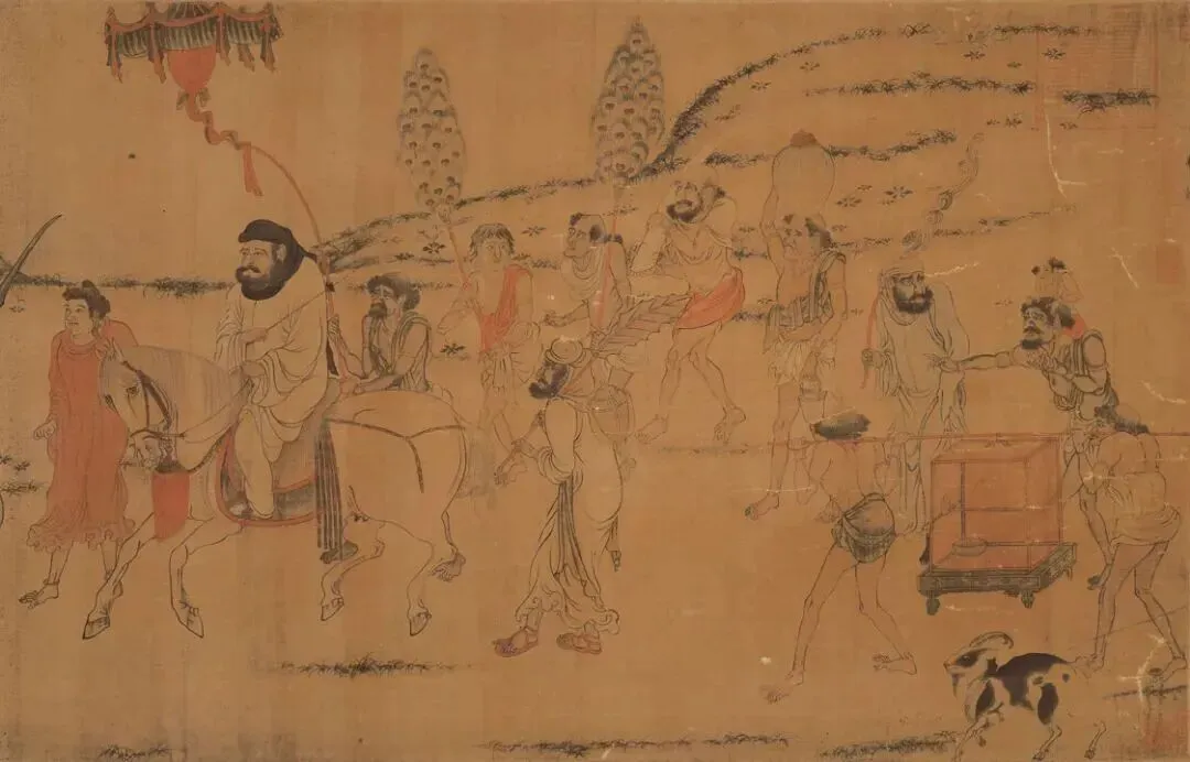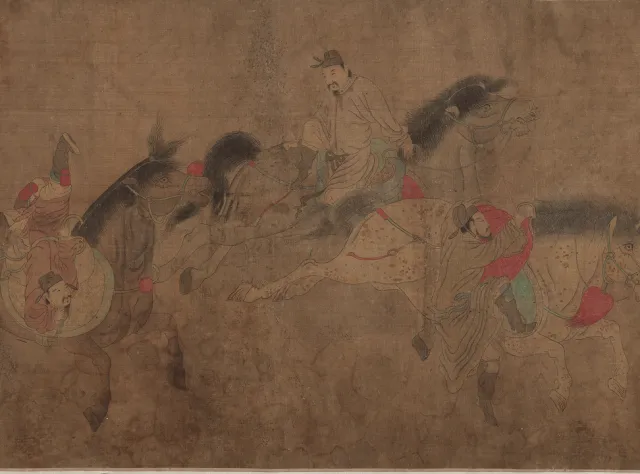 作者是辽代的贵族画家,人称东丹王,原名耶律倍,后来投奔后唐改名为李赞华。画面居中骑白马者应为他本人,其面容沉静微郁,似暗合其弃辽投唐后复杂心境,为画面增添一层深沉的情感维度。它让我们看见,无论在中原还是塞外,马始终是人们征途与归途中,那位静默而可靠的同行者。