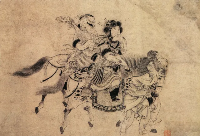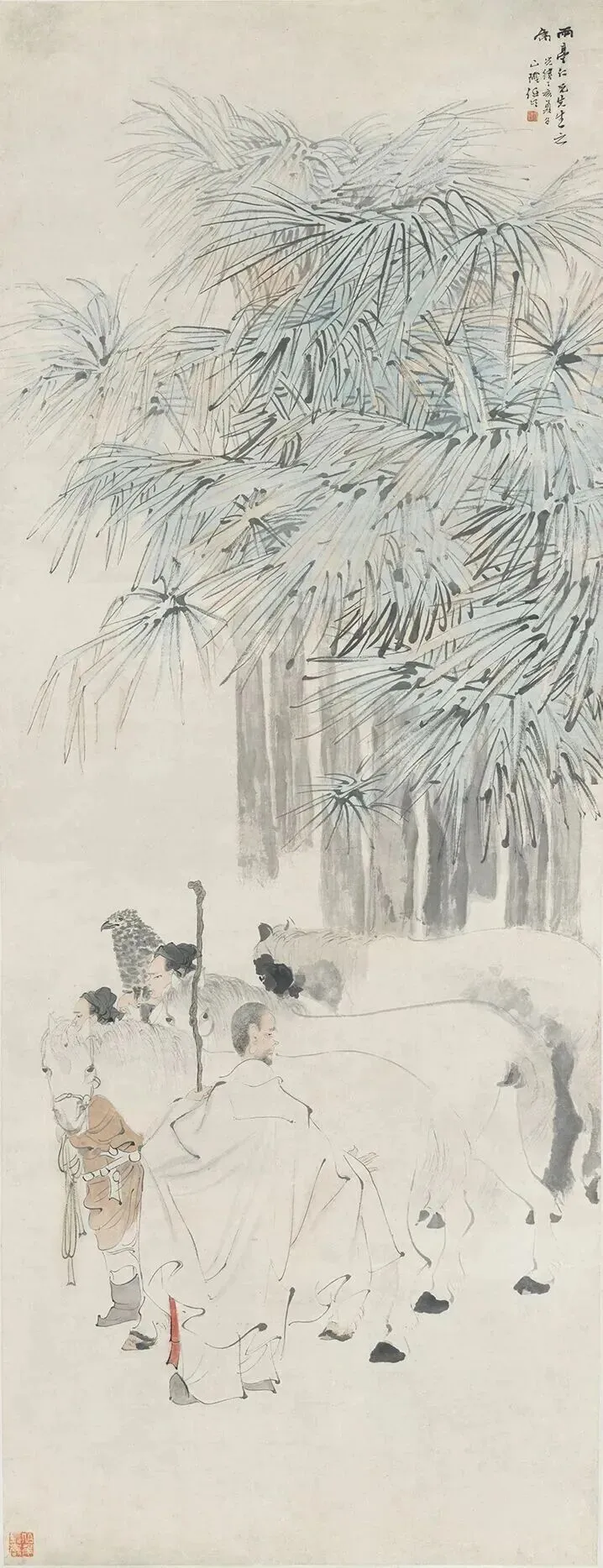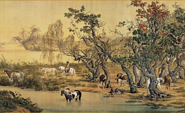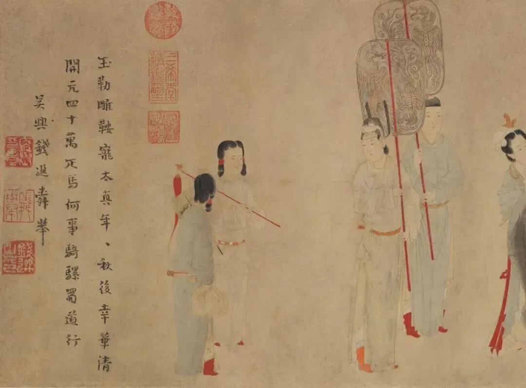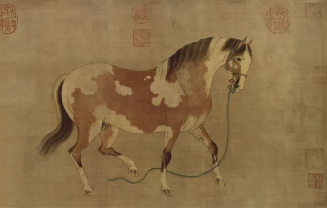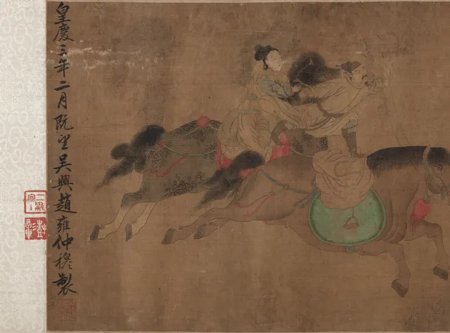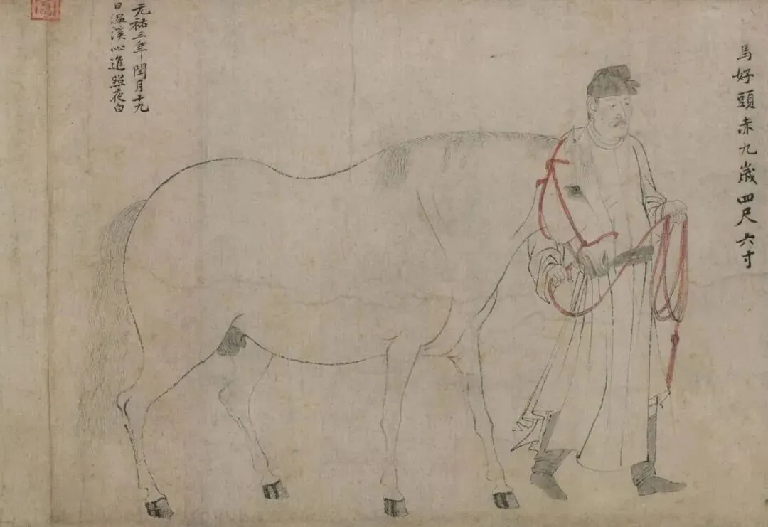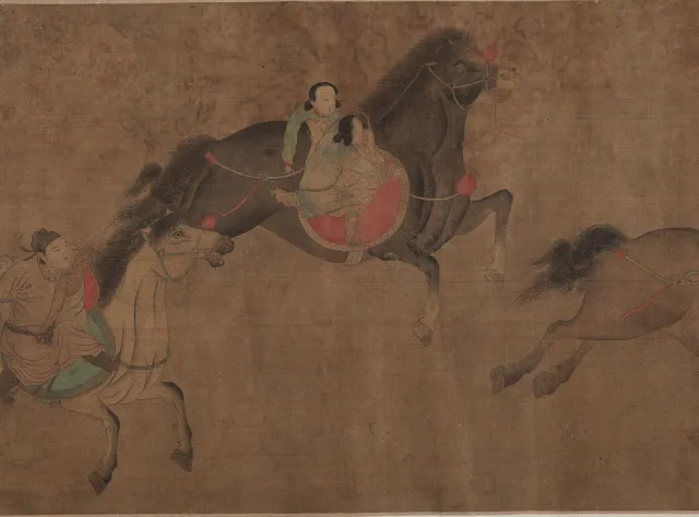 此卷描绘唐玄宗与杨贵妃上马出行的经典场景。钱选承续唐宋遗风,又融入元人笔墨意趣,使这一历史瞬间在工致中见清雅,在叙事中蕴诗情。马在此处,既是帝王威仪与宫廷生活的组成部分,也是连接真实与传说、历史与艺术的视觉纽带。