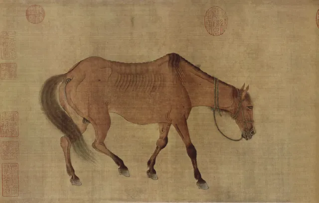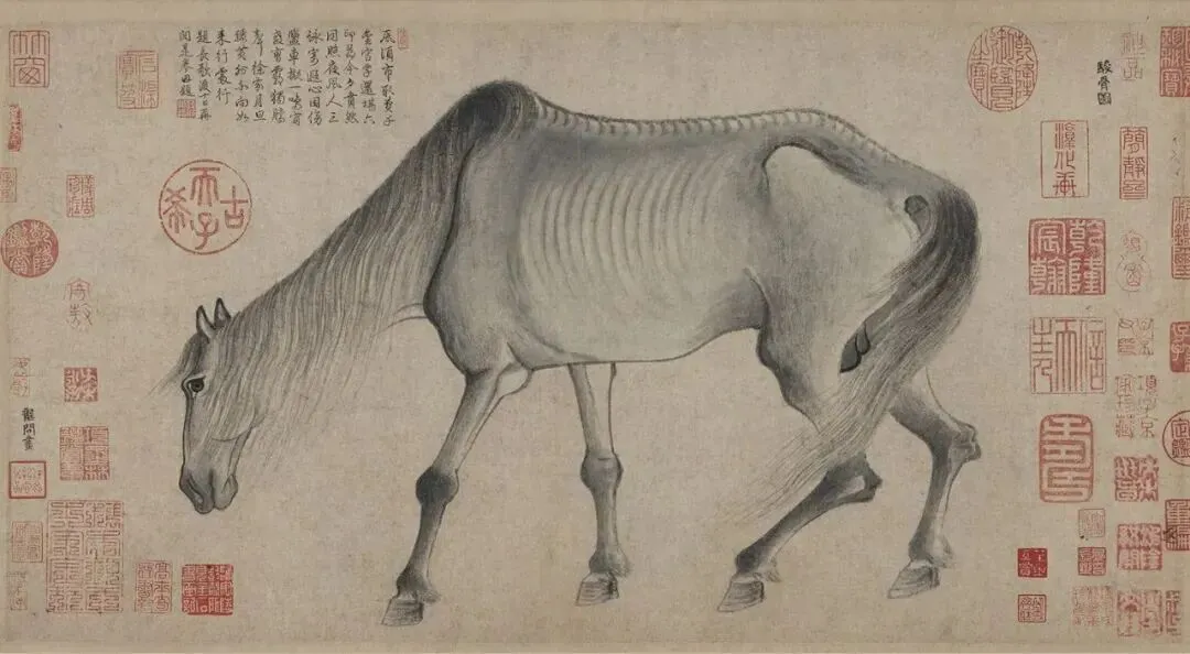 龚开于宋末元初所作水墨画卷,绘一瘦马低首独立,似伏枥之状。鬃毛飘动,有秋风萧瑟、不胜寒冷之感,而其眼神凛冽,仍寓不屈之态。画后自跋云:“经言马肋贵细而多,凡马仅十许肋,过此即骏足。惟千里马多至十有五肋。假令肉中画骨,渠能使十五肋现于外。现于外,非瘦不可,因成此相,以表千里之异,顽劣非所讳也。淮阴龚开水木孤清书。”